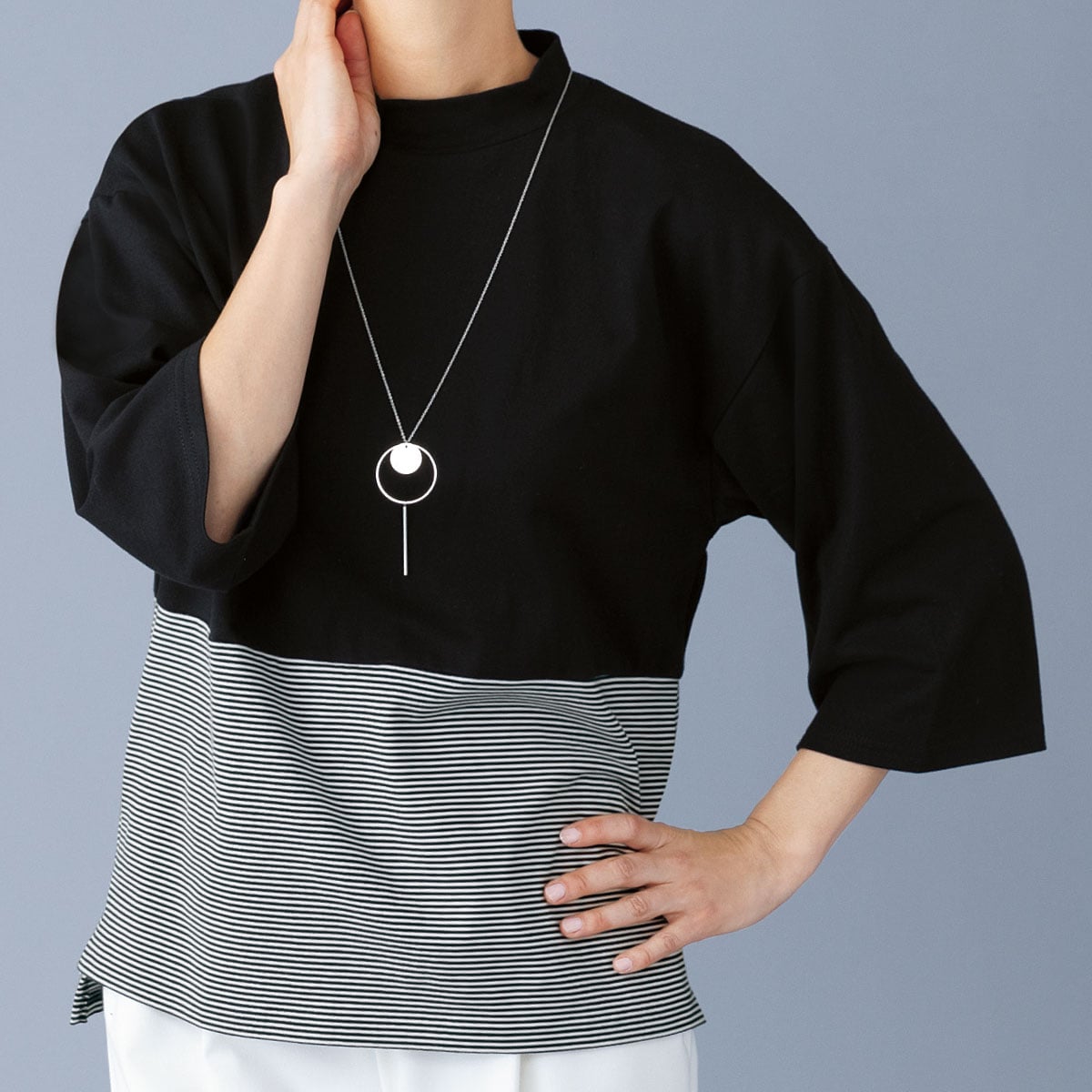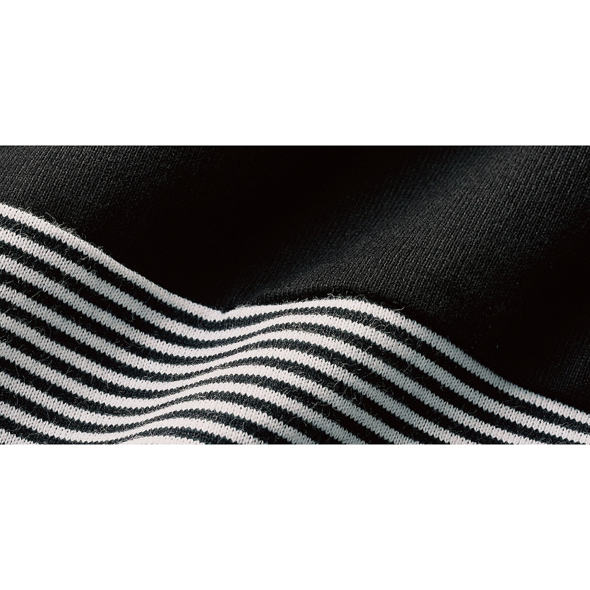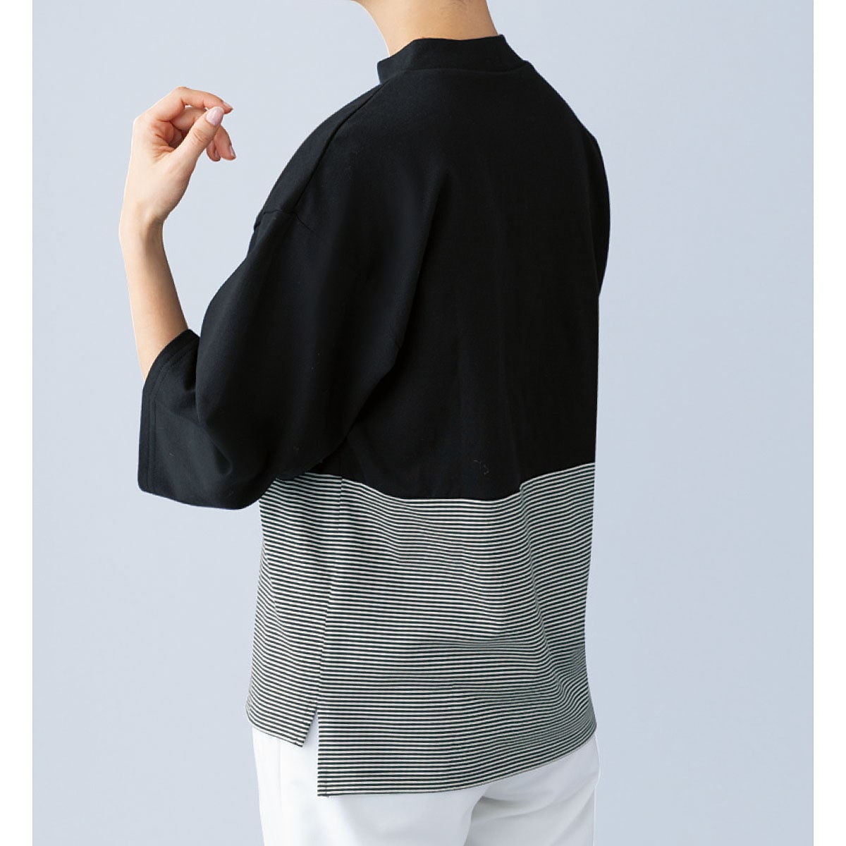 マンネリになりがちな黒トップスを、細めのボーダーで大胆に切り替えて新鮮に。ゆったり着られてハンサムに着映えるデザインは、六分袖の抜け感も、軽やかな印象のポイントです。ー素材特性ー肌触りが良くちょうどいい厚みのカットソー素材。