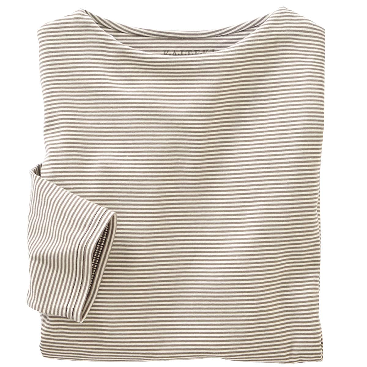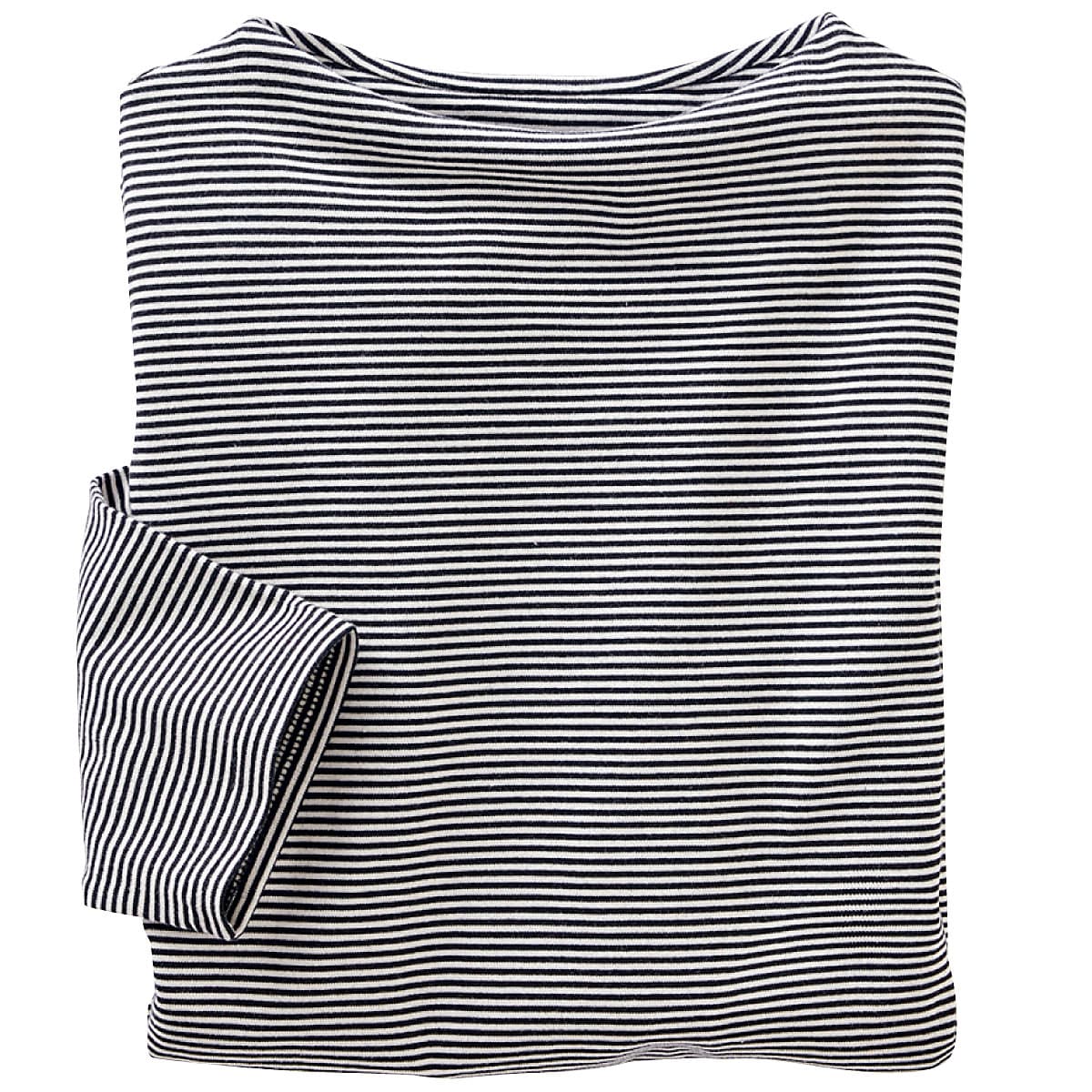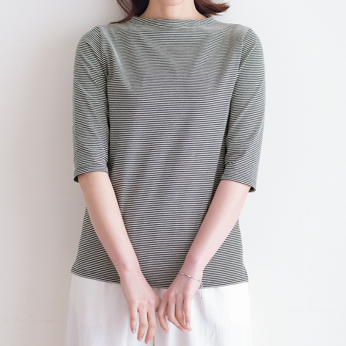 柔らかな色使いと細かなピッチがカジュアルすぎない洗練ボーダー。首に沿うようなネックラインとひじが隠れる袖丈で、大人が着やすい仕様に仕上げました。ー素材特性ー肌触りのよい綿100%。