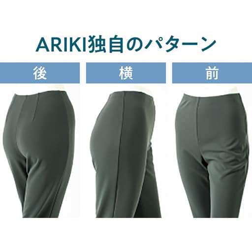 【ラク&キレイの秘密】1.ARIKI独自のパターン後ろ身より前身を多くとることにより、ポッコリお腹をカバーし、サイドラインもキレイ。素材が伸縮することでウエストゴムのしわができづらく、スッキリとしたウエスト周りに。ウエストには平ゴムを採用。着けていることを忘れそうな程、優しくしっかりとウエストをホールド。2.うっかり背中が・・・なんて心配無用深めの股上でしゃがんでも背中がでにくく、おなかもすっきり収まり安心して着用できます。3.全方向ストレッチでストレスゼロしっかり伸びるのにちゃんと元に戻るストレッチ素材。階段やしゃがんだりする動作もラク。ー素材特性ー三菱ケミカル「ボナンザ®」空気を含んだような独特の風合いが特徴の上質な素材。~ARIKI~機能性とデザイン性を兼ね備え、「楽でキレイ」を叶えるARIKIの純日本製パンツ。素材も含め、全ての工程を国内で行い、丁寧なものづくりが人気のブランド。【選べる股下丈】65cm・70cm■ポリエステル96%ポリウレタン4%●ウエスト総ゴム仕様●手洗いOK●日本製