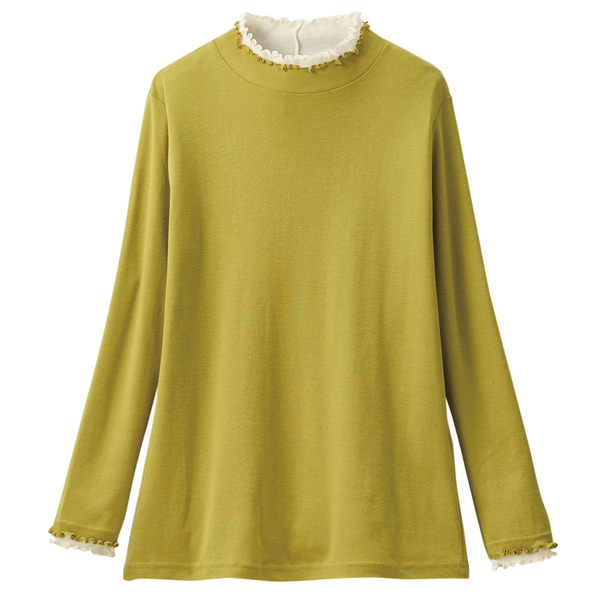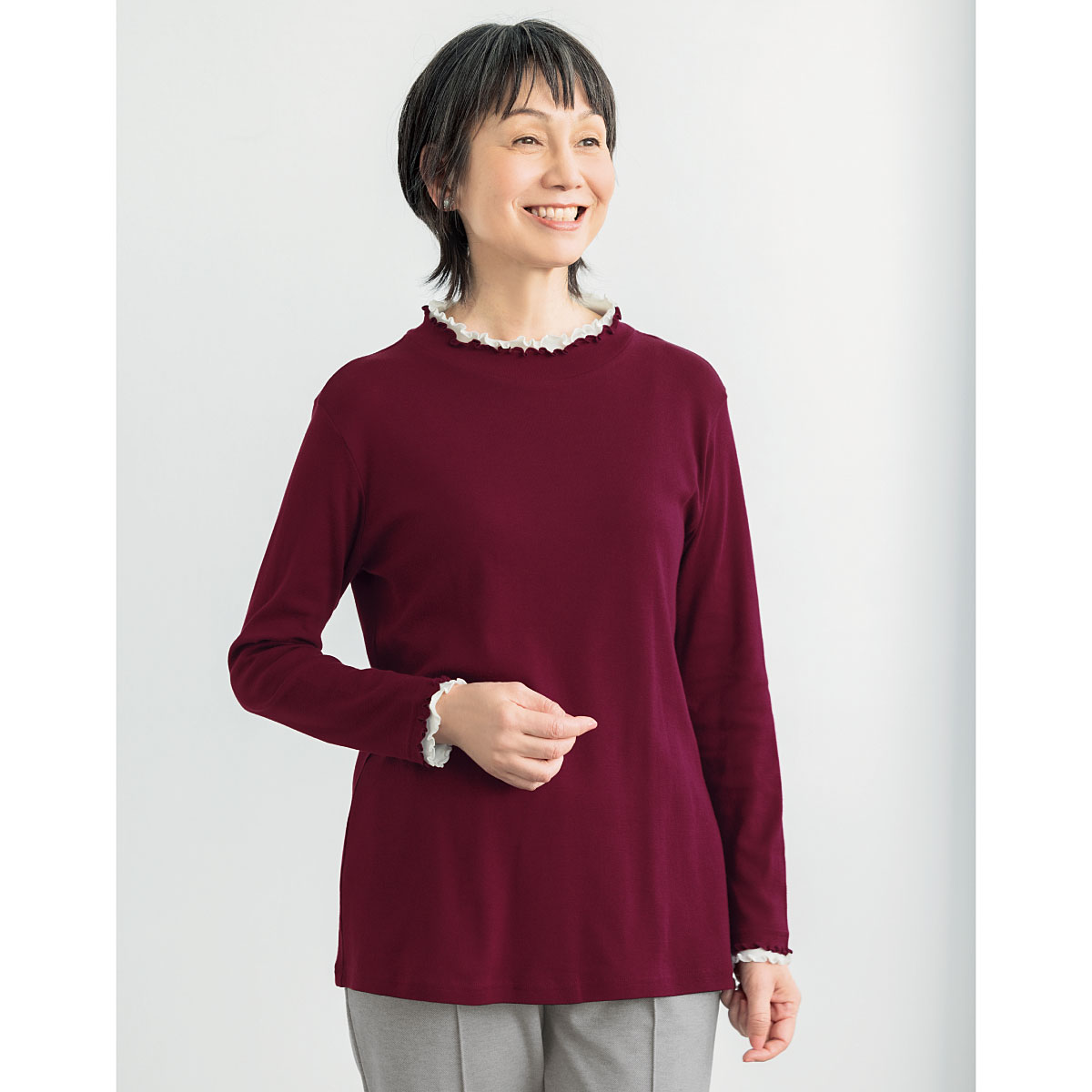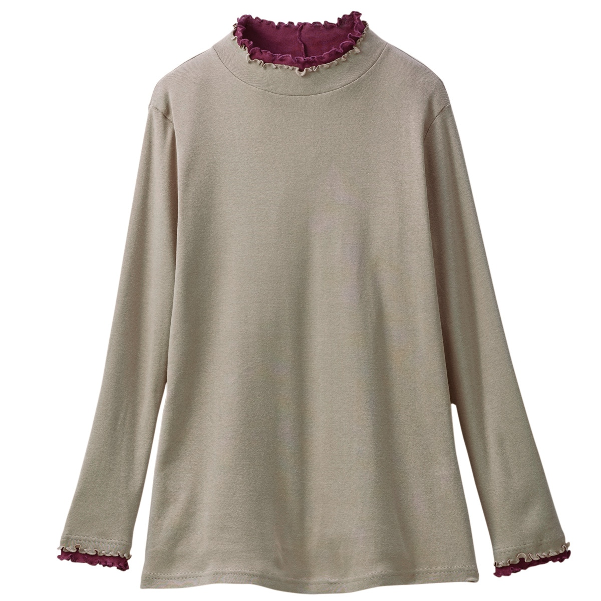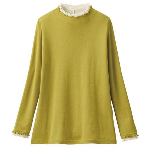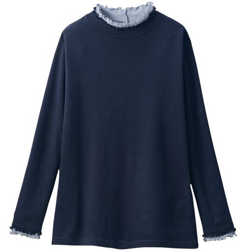 きれいな配色使いでコーデも気分も華やかに。うれしい機能やキレイ色に注目!ひと工夫こらした着回し服!ジャケット等のインナーとしても着映えます。ーデザインー衿元と袖口を二重仕立ての配色使いにし、重ね着をしているようなデザインがポイント。ー素材特性ー綿100%