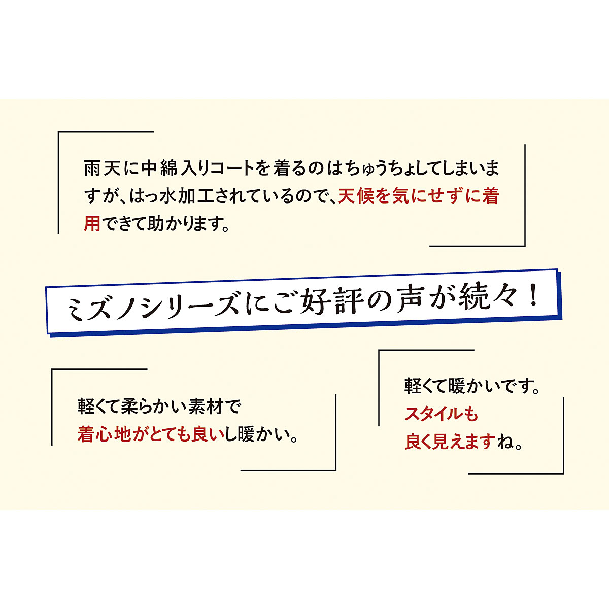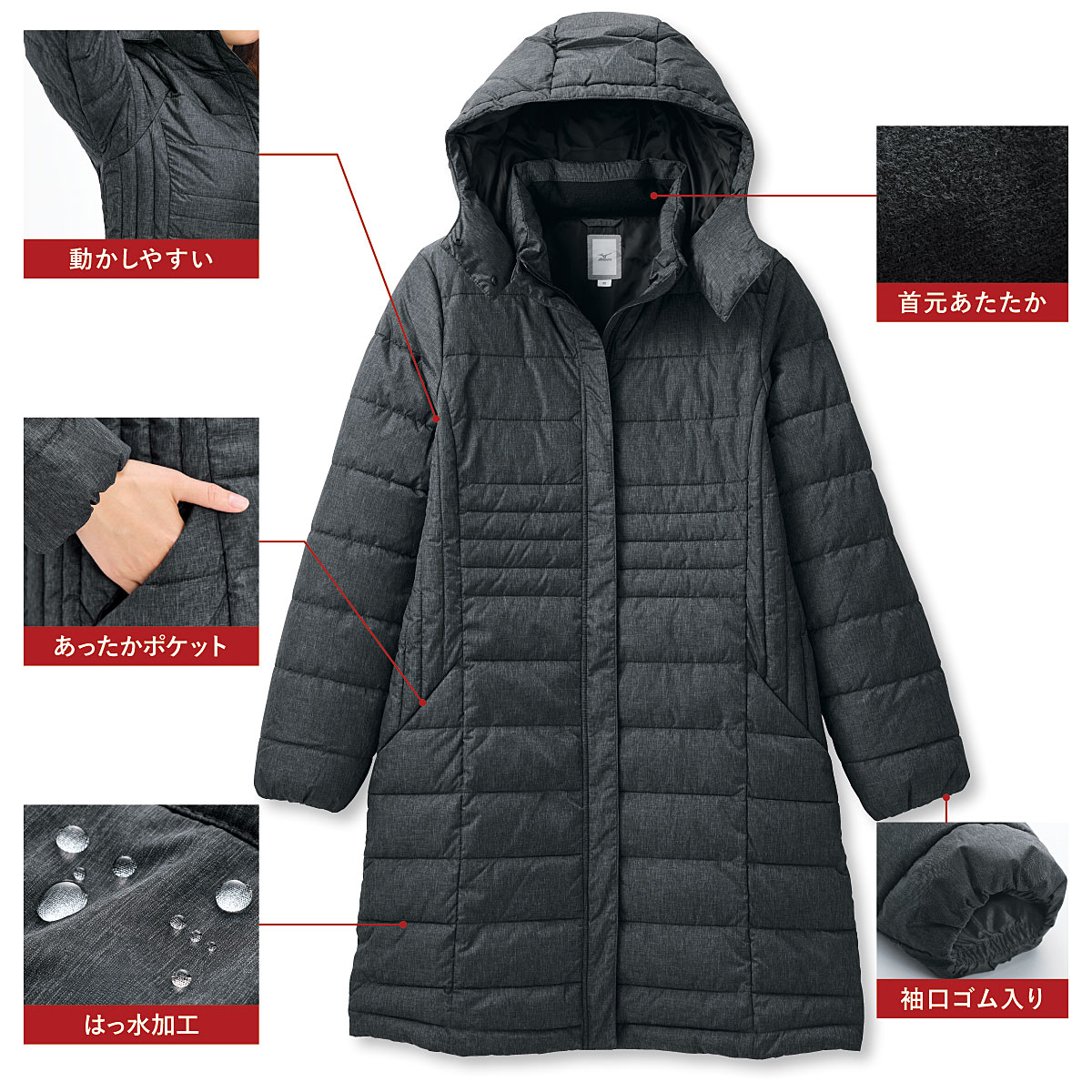 ーこだわりPOINTー1.衿内側は起毛素材で首元あたたか。2.ミズノ独自のダイナモーションフィット設計で、腕の上げ下げがスムーズ。3.ポケット口に角度をつけて出し入れしやすく、内側の手甲側は起毛素材であたたか。4.袖口はゴム仕様であたたかさを逃しにくい。5.はっ水加工を施し、急な雨でも安心。■[表地]ブラック・ライトグレー/ナイロン67%、ポリエステル33% ブラウン・キャメル・ダークネイビー/ポリエステル100% [裏地]ポリエステル100% [中わた]ポリエステル100% ●重量/約800g(Mサイズ)●前左右ポケット、フード取り外し可、ファスナーあき●手洗いOK●ミャンマー製
