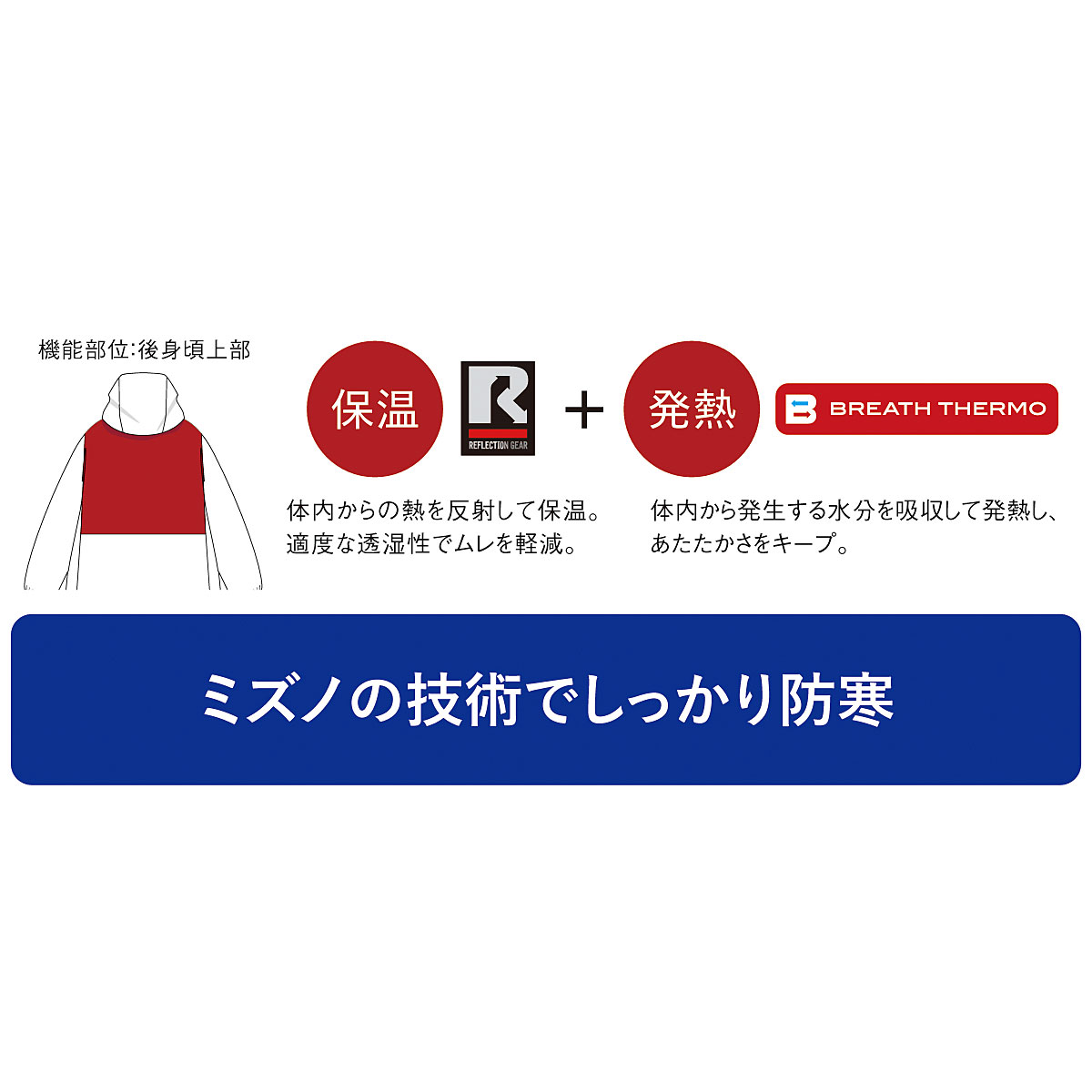 おうちで洗えてクリーニング代節約!大人気のミズノコートシリーズがバージョンアップして登場。ーバージョンアップPOINTー1.胸・腰まわりにゆとりをもたせた新シルエットでより着やすく。2.フードを取り外ししてすっきりと着用OK。ー素材特性ー吸湿発熱素材の「ブレスサーモ」と保温性に優れた「リフレクションギア」を使用。体内からの熱を反射して保温し、適度な透湿性でムレを軽減。※機能部位:後身頃上部