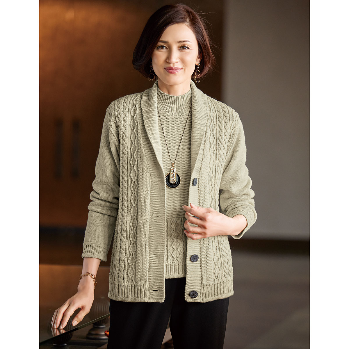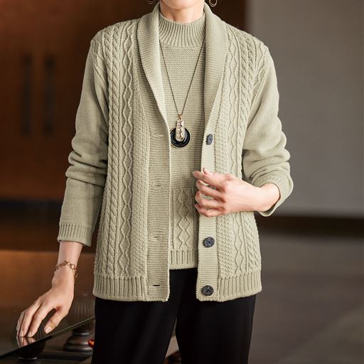 上質なウール100%のケーブル編みが印象的なニットジャケット。ー素材特性ー熟練の技術が引き出す美しい編み地の上質なウールを100%使った素材。