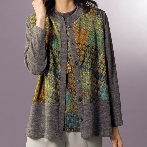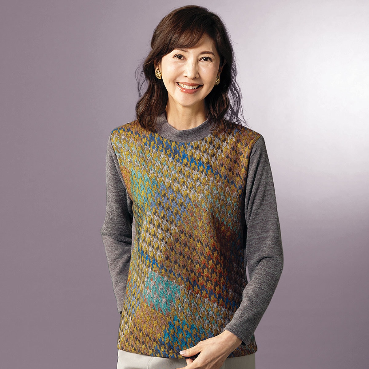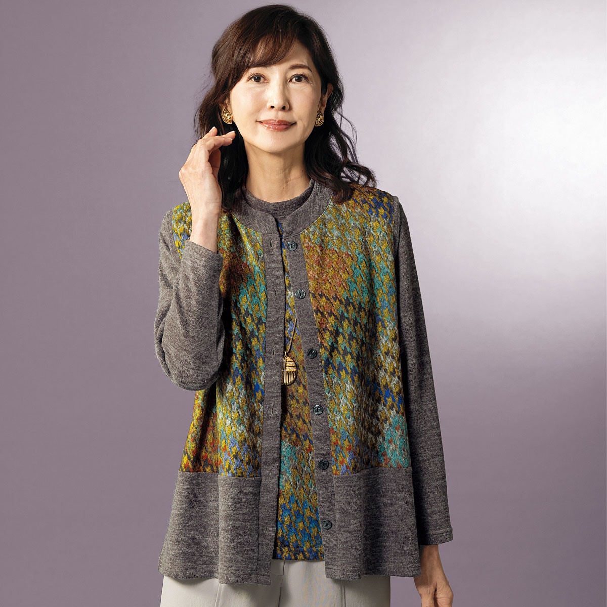 柄で魅せて印象アップ。見せる重ね着で華やかに