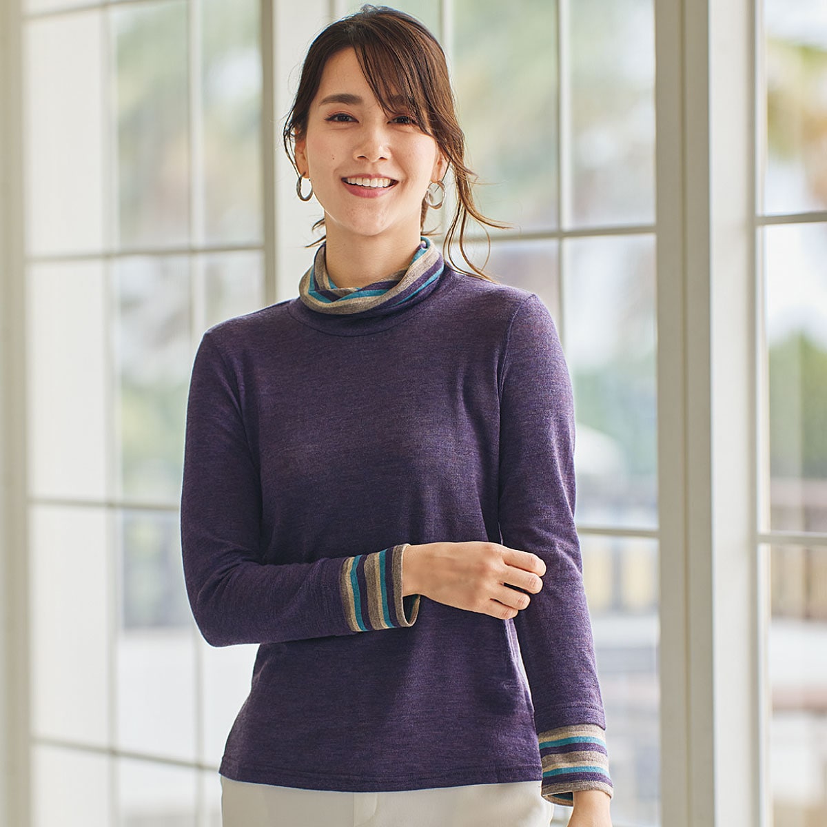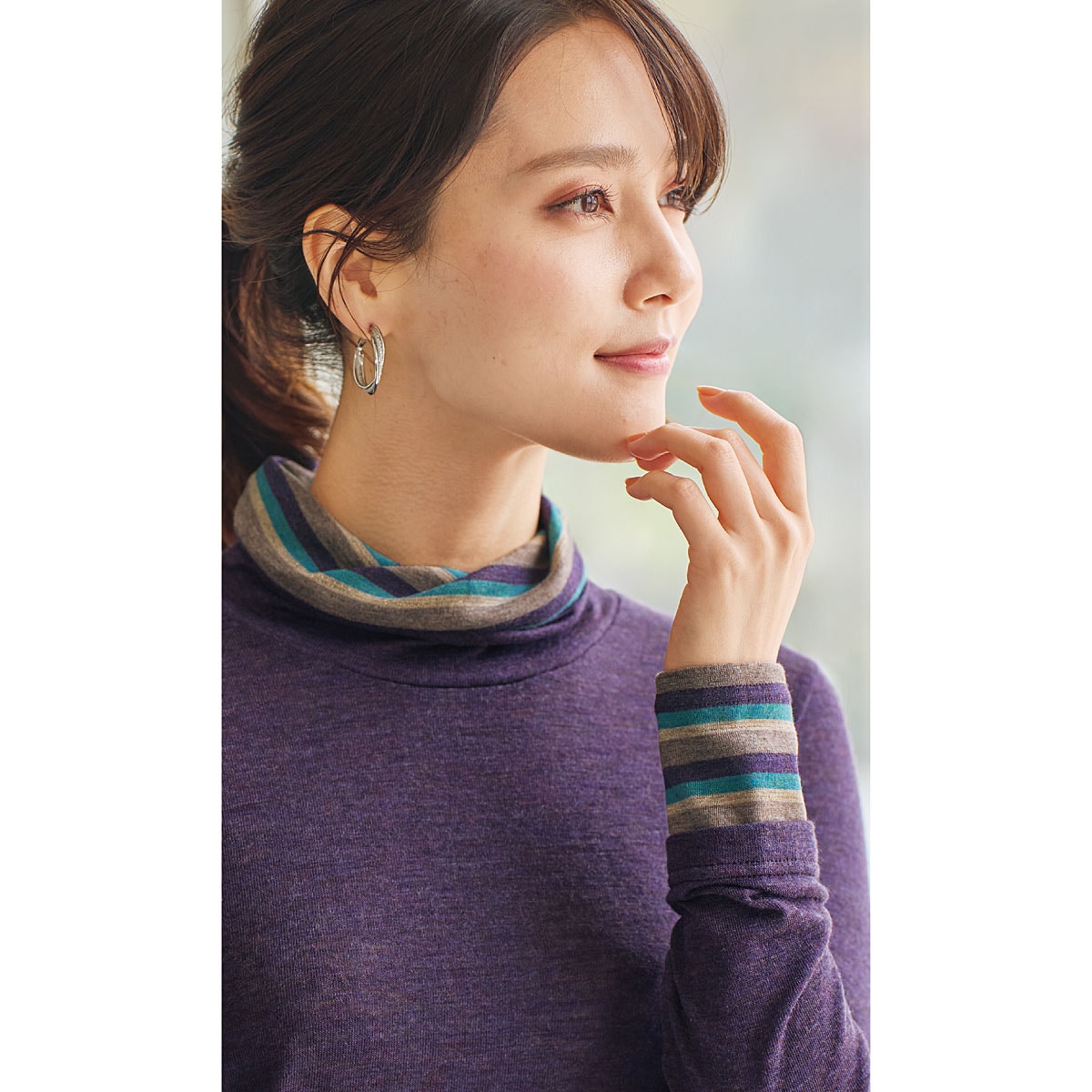 日本製の上質感が漂う、メランジ調のハイゲージカットソー。ーデザインーねじり襟と袖口に、ほんのりラメ入りのカラーボーダーを効かせたデザインも素敵。
