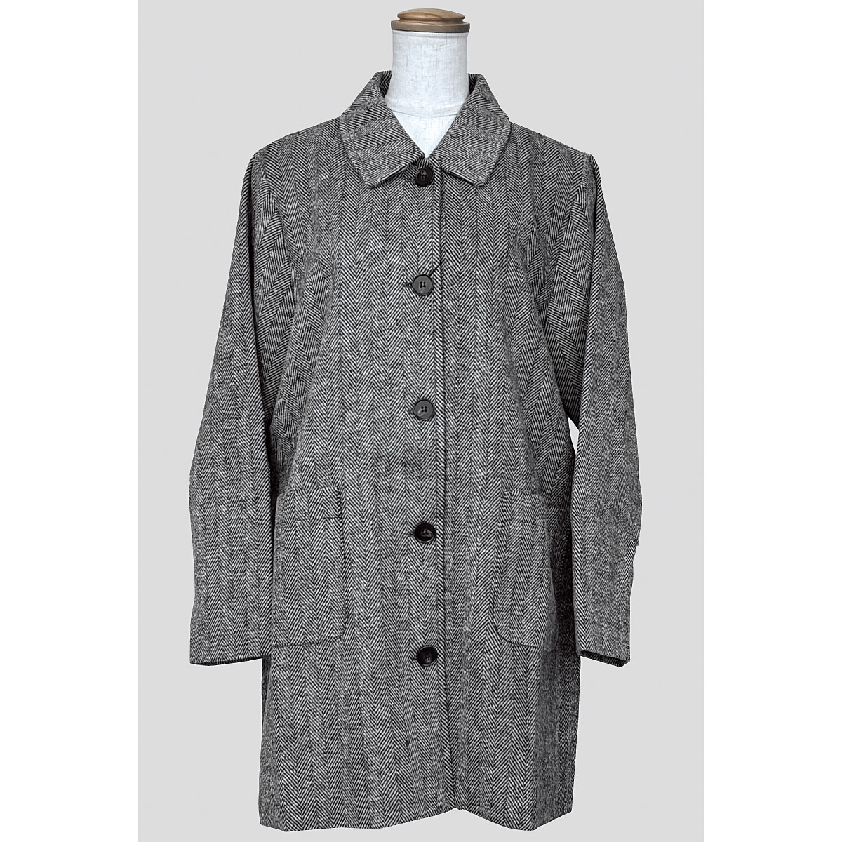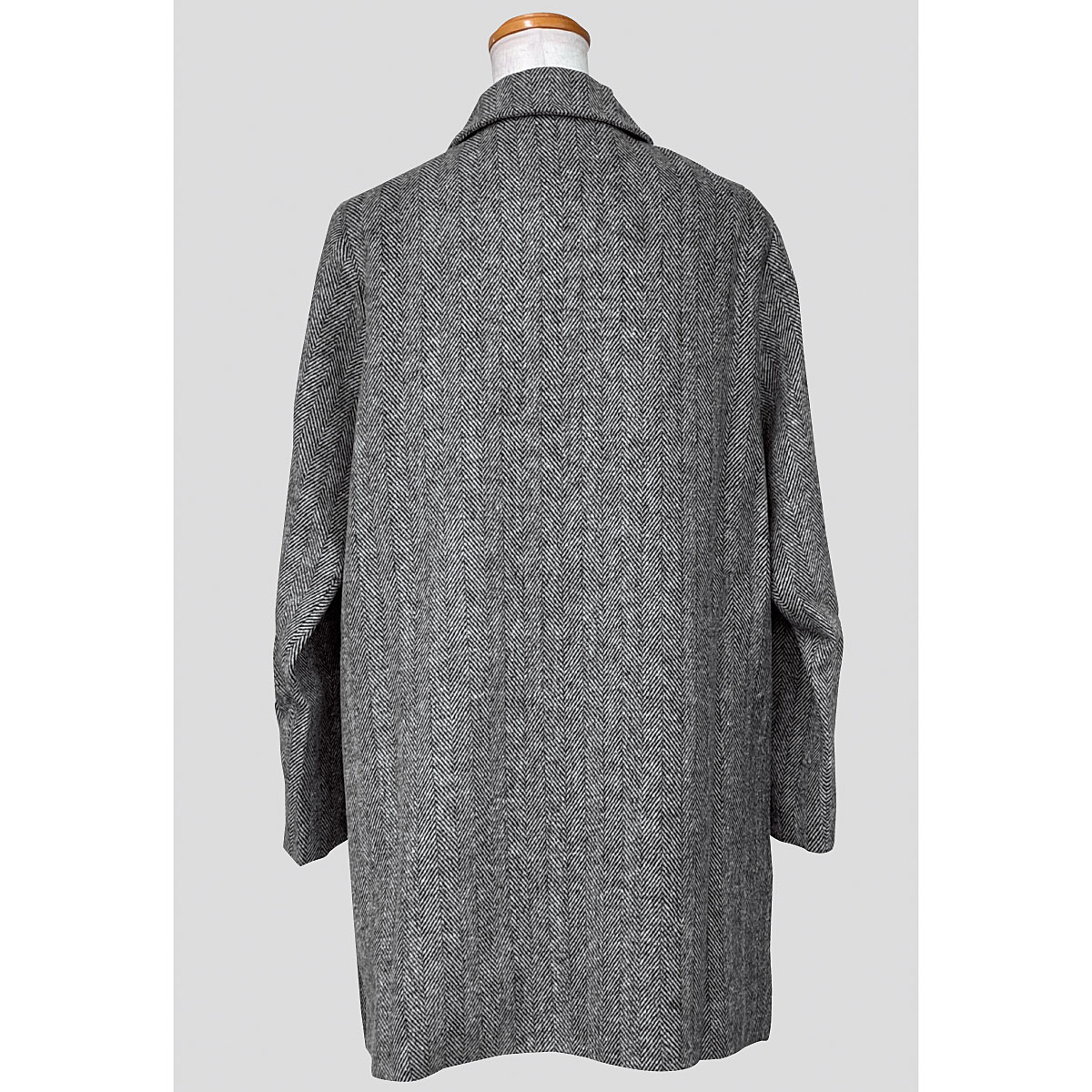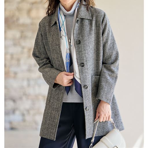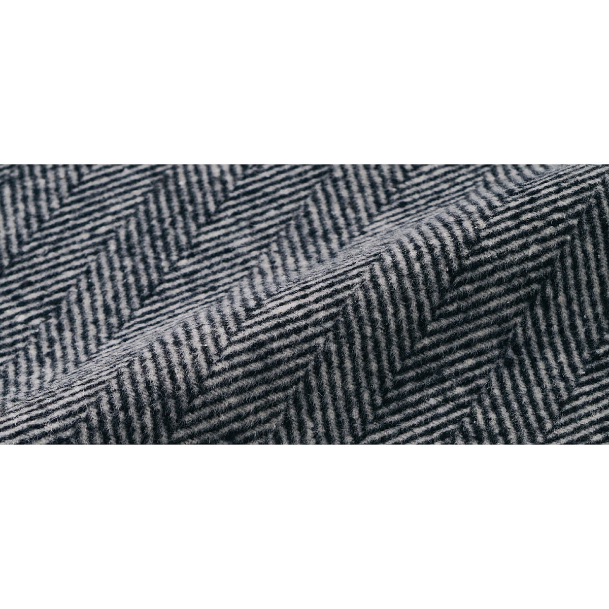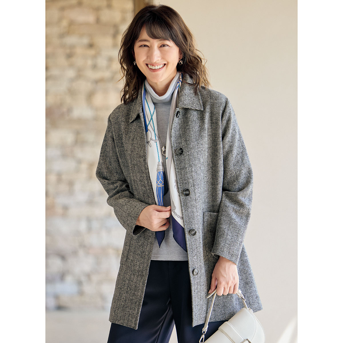 正統派のグレー系ヘリンボーン柄のジャケットは、ゆったりめのシルエットが今どき。