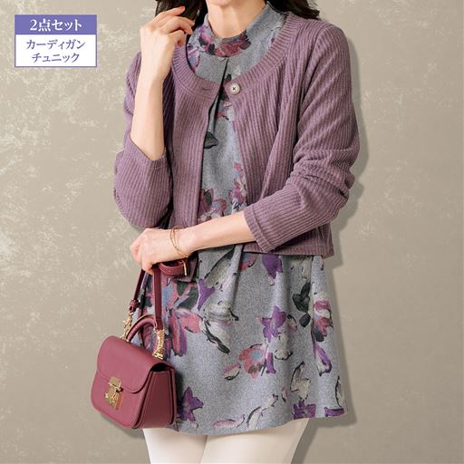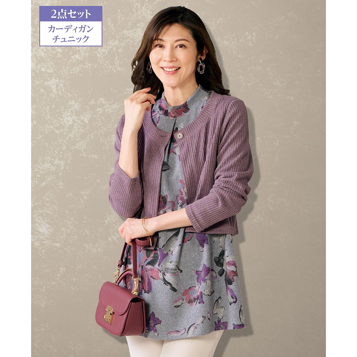 お顔映りの良いローズ系カラーでお出かけスタイルを品よく彩ります。チュニックは前タック入りで体型カバーも。【2点セット】・チュニック・カーディガン
