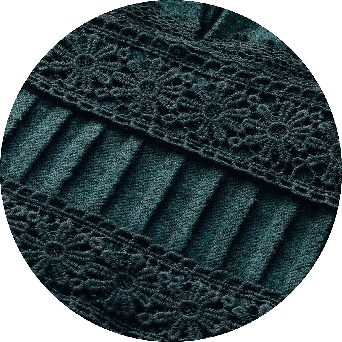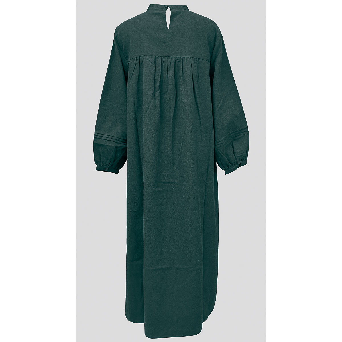 ぬくもりある起毛の織生地を使用し、胸元からのギャザーでゆとりあるフレアシルエットを演出。繊細な花レースと胸元と袖にあしらったピンタックで華やかに。ー素材特性ーやや厚みのあるネル生地。