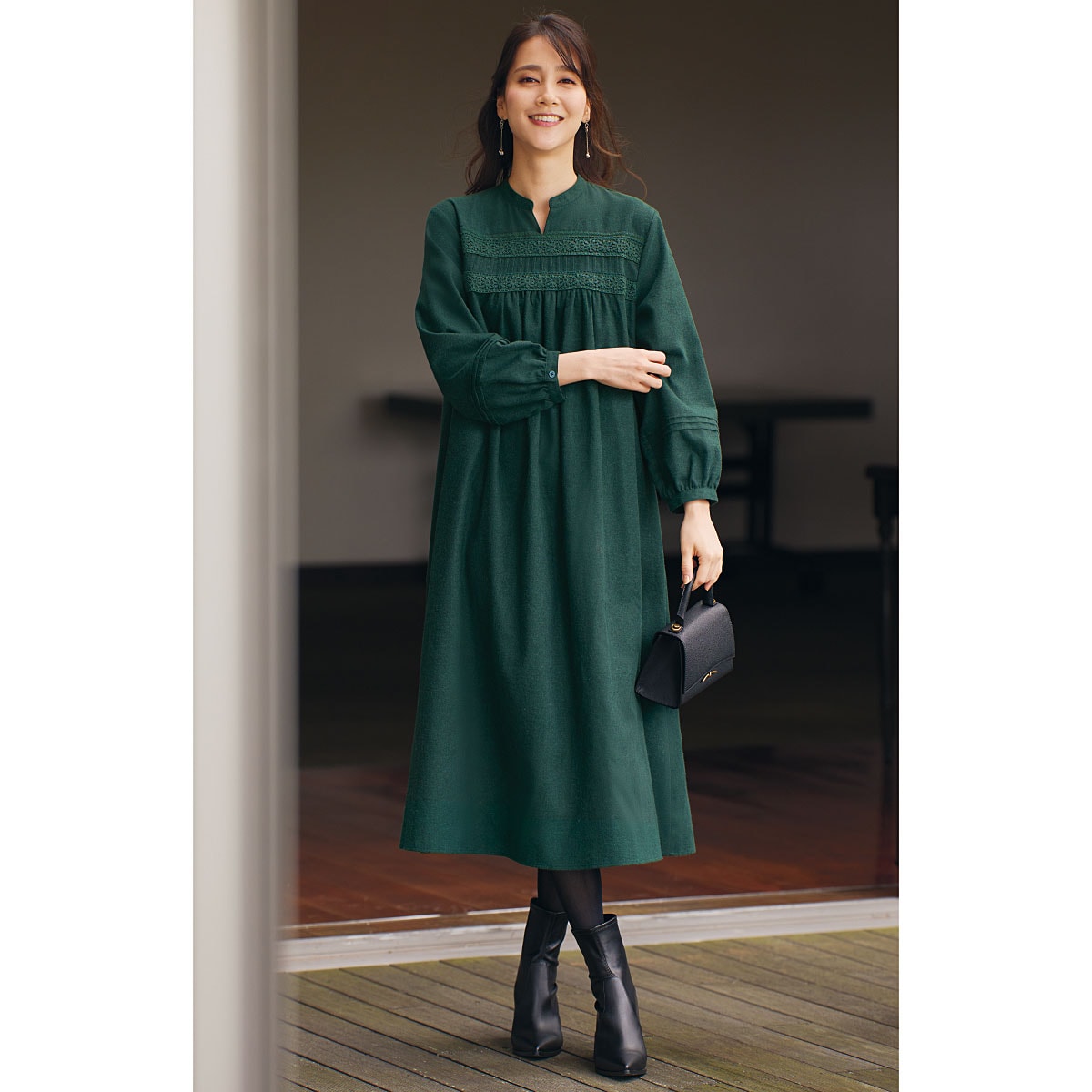 グリーンの優しさと微起毛のぬくもり感じるワンピース