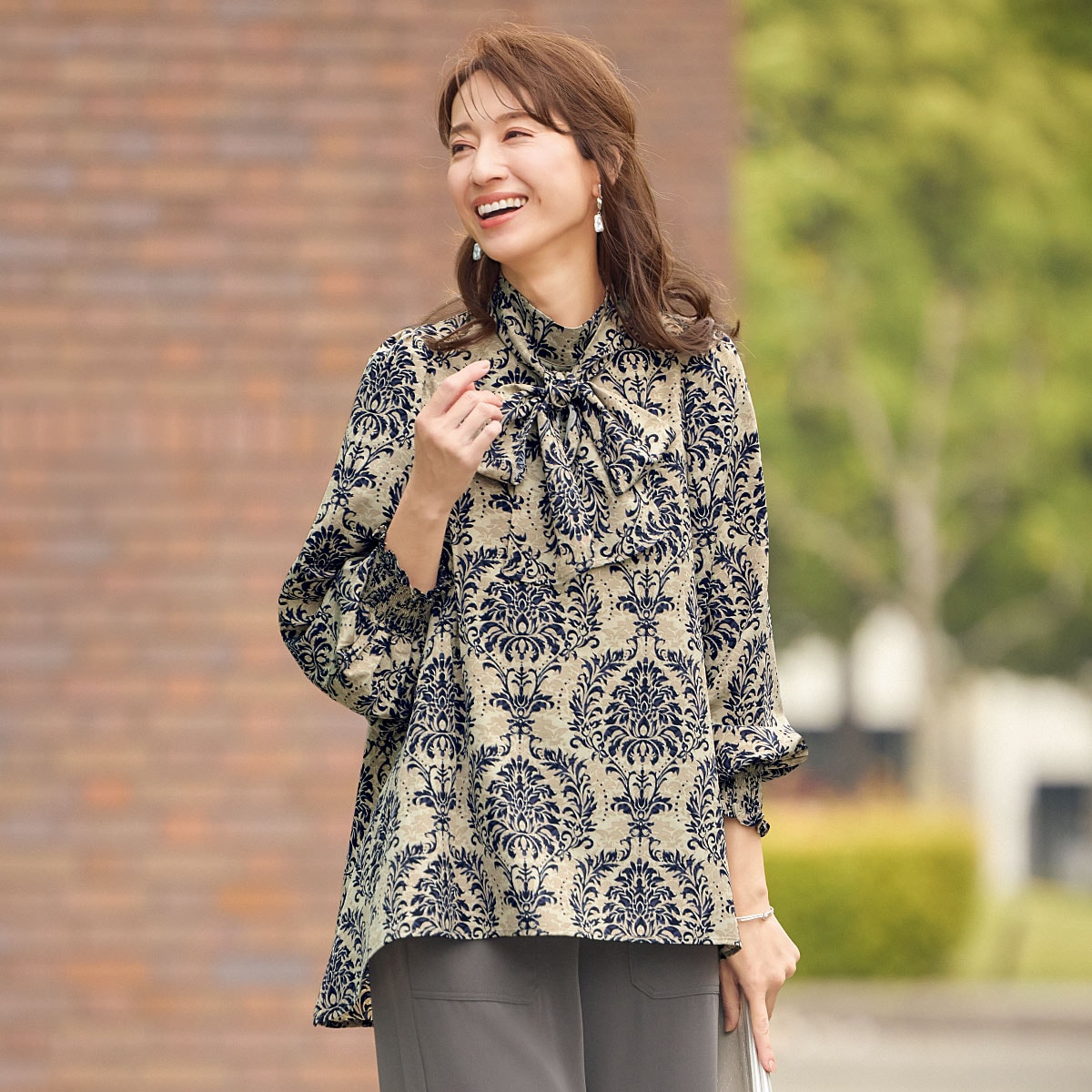 大きなボウタイや袖口シャーリングのパフ袖が、優美さを際立たせるダマスク柄プリントのブラウス。