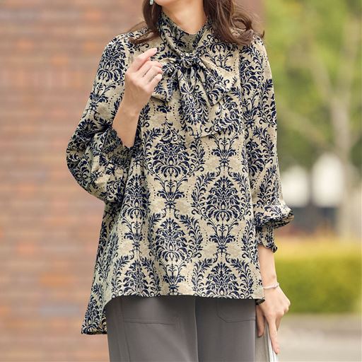 • ボウタイダマスク柄ブラウス | ベージュ系