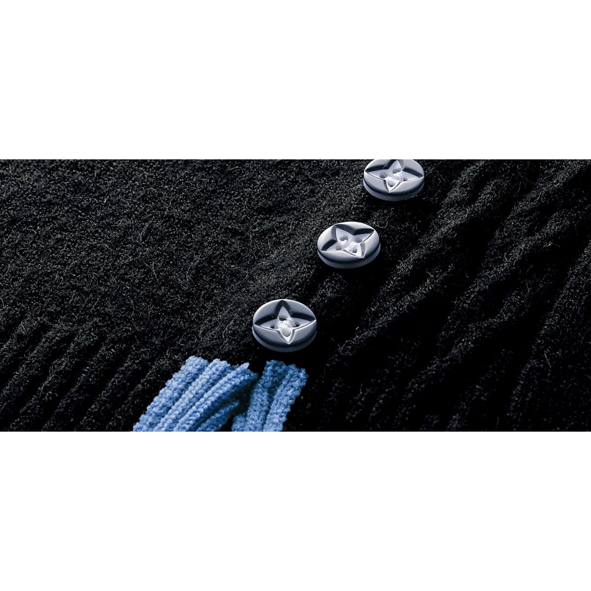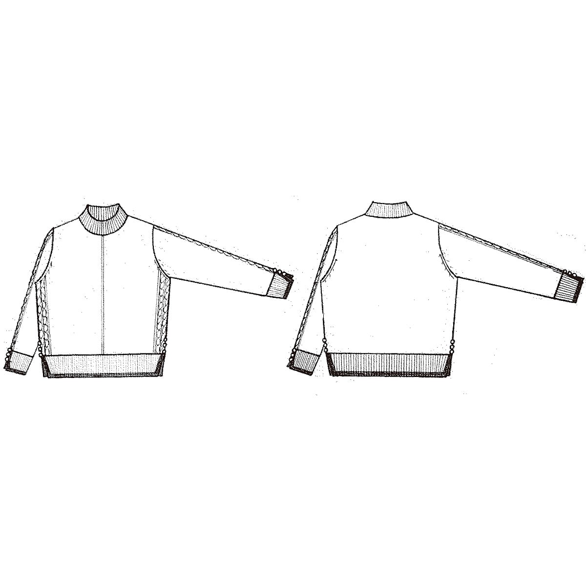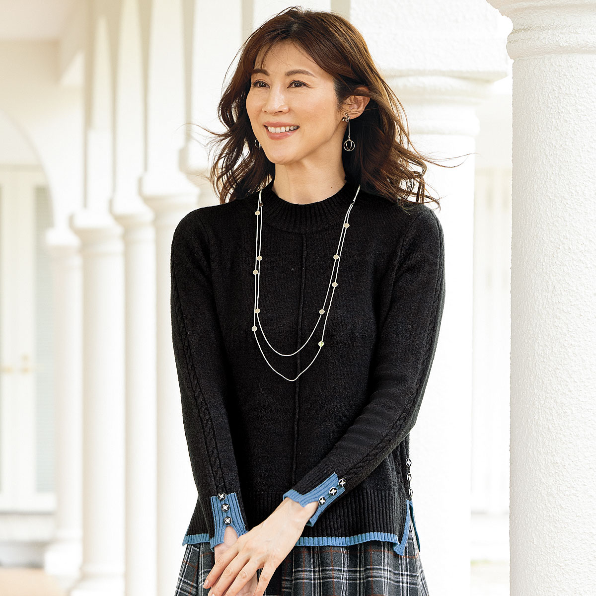 配色ラインやデザインボタンが、お洒落なアクセントのプルオーバー。前身頃や袖、脇の縦ラインを強調した編み地がすっきりと見せます。ー素材特性ーやや厚みがある目の詰まったニット素材。ーデザインー袖と脇にはケーブル編みで切り替え仕様。