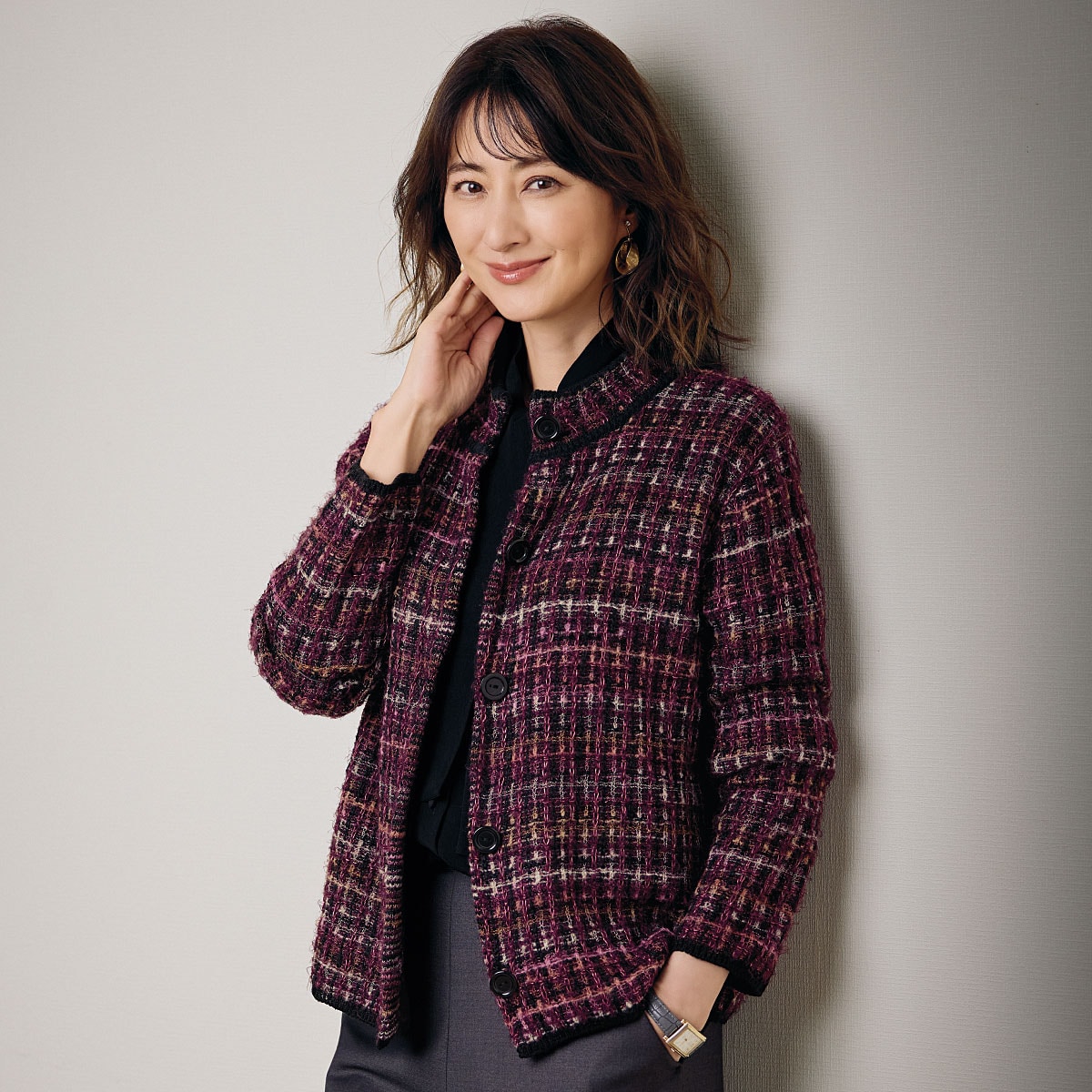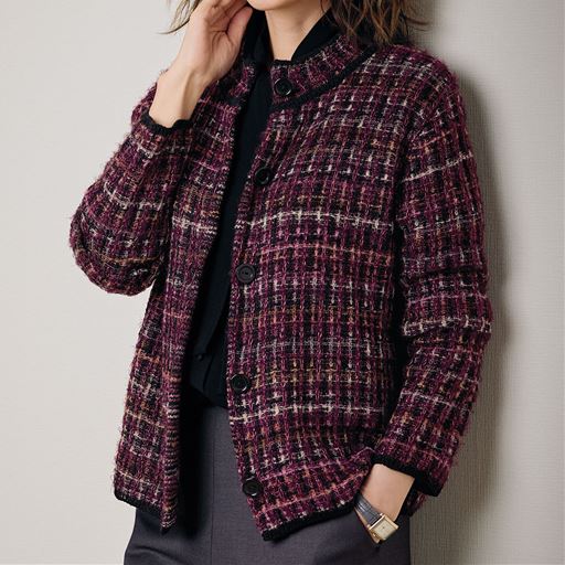 日本製のツイードニットジャケットは、伸びやかな着ごこちと上品な色合いが魅力。襟元や袖口、裾は配色で引き締めてクラシカルな雰囲気に仕上げました。ー素材特性ーやや薄手でざっくりと編んだニット素材。