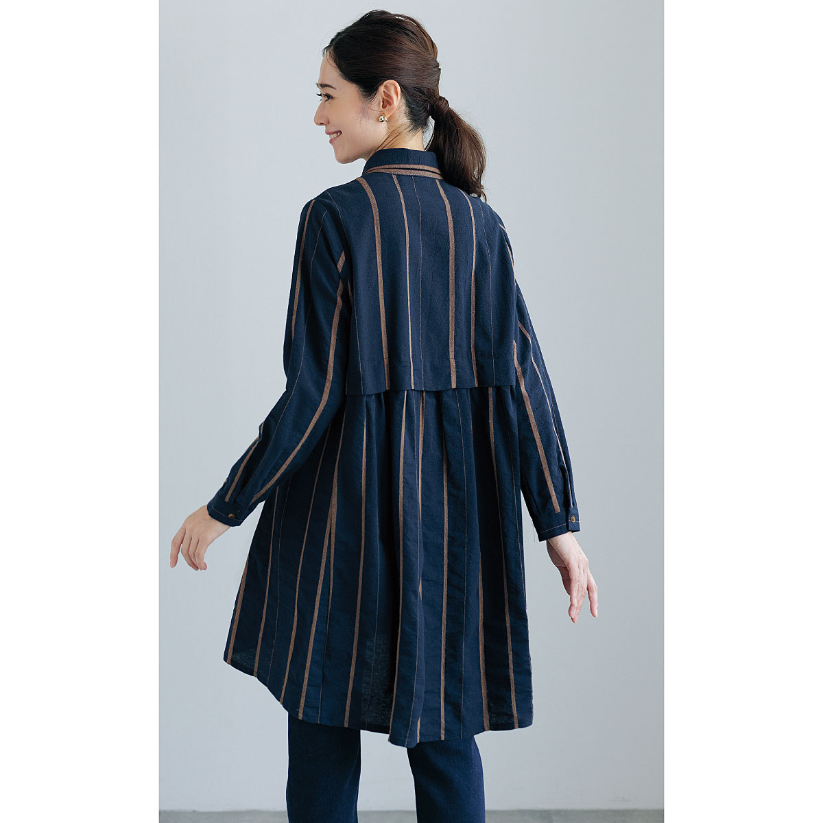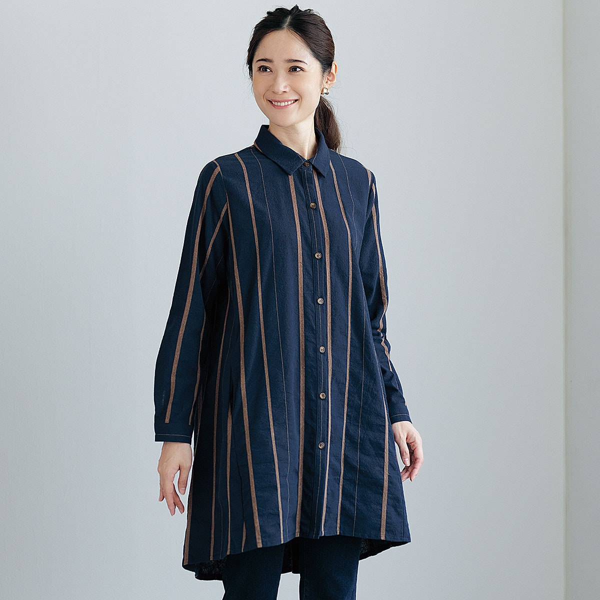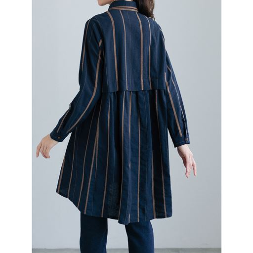 ジャカード織の縦縞がハンサムで、襟付きデザインもスマート。背中のタックで後ろ姿まで映えるシャツチュニックは、ゆったり着られてすらりと細見えする一枚。ー素材特性ーしっかりとした肌触りで着るほどになじむ綿100%のシャツ素材。ーデザインー長めの後ろ身丈でヒップをしっかりカバー。