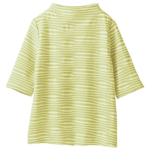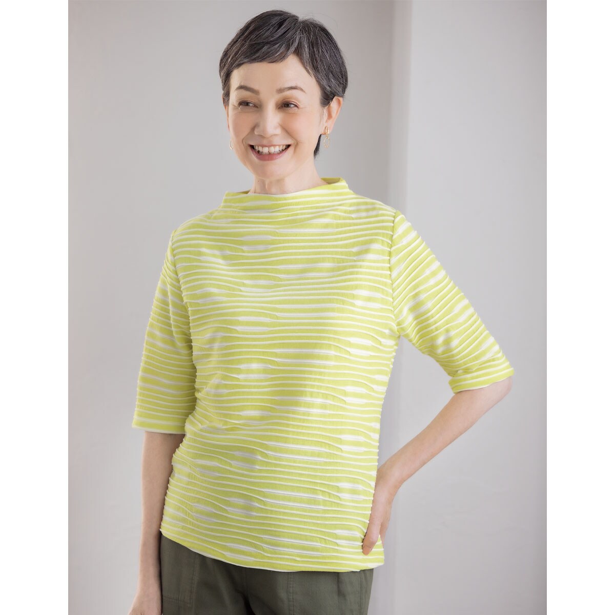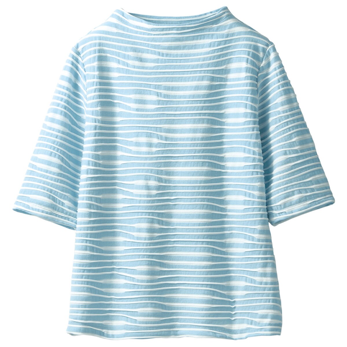 さざ波のような立体感で、表情までも爽やかに。ー素材特性ー通気性に優れソフトな風合いの「涼しや®」素材を使用したふくれジャカード素材。立体感があり、体のラインを拾いにくい。伸縮性にも優れているので、体型カバーにも!ーデザインーやや高めのボトルネックが首元をおしゃれにカバーします。