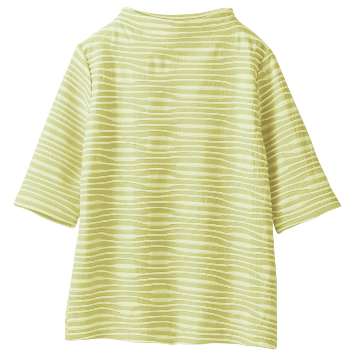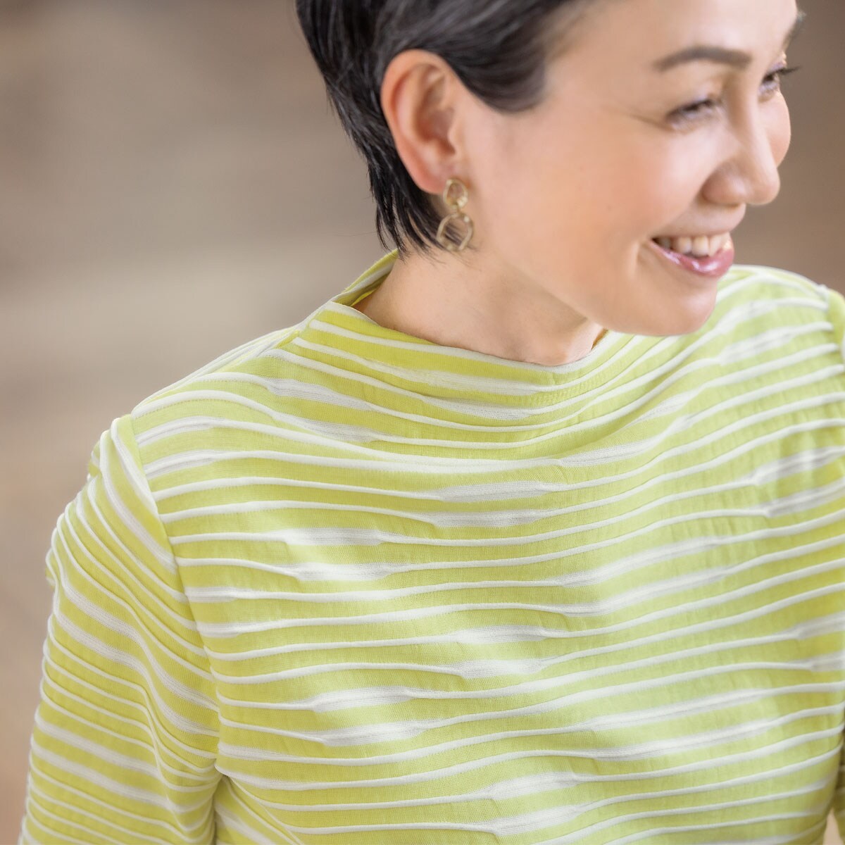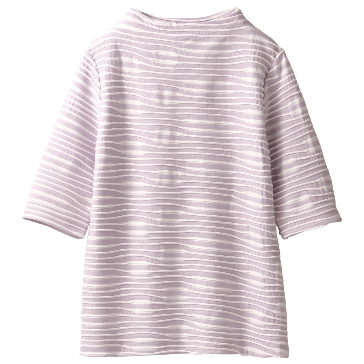 さざ波のような立体感で、表情までも爽やかに。ー素材特性ー通気性に優れソフトな風合いの「涼しや®」素材を使用したふくれジャカード素材。立体感があり、体のラインを拾いにくい。伸縮性にも優れているので、体型カバーにも!ーデザインーやや高めのボトルネックが首元をおしゃれにカバーします。