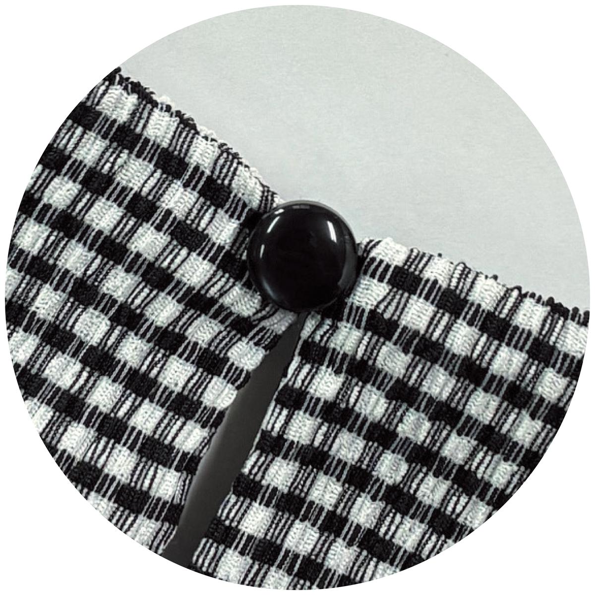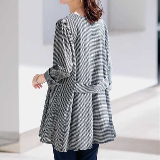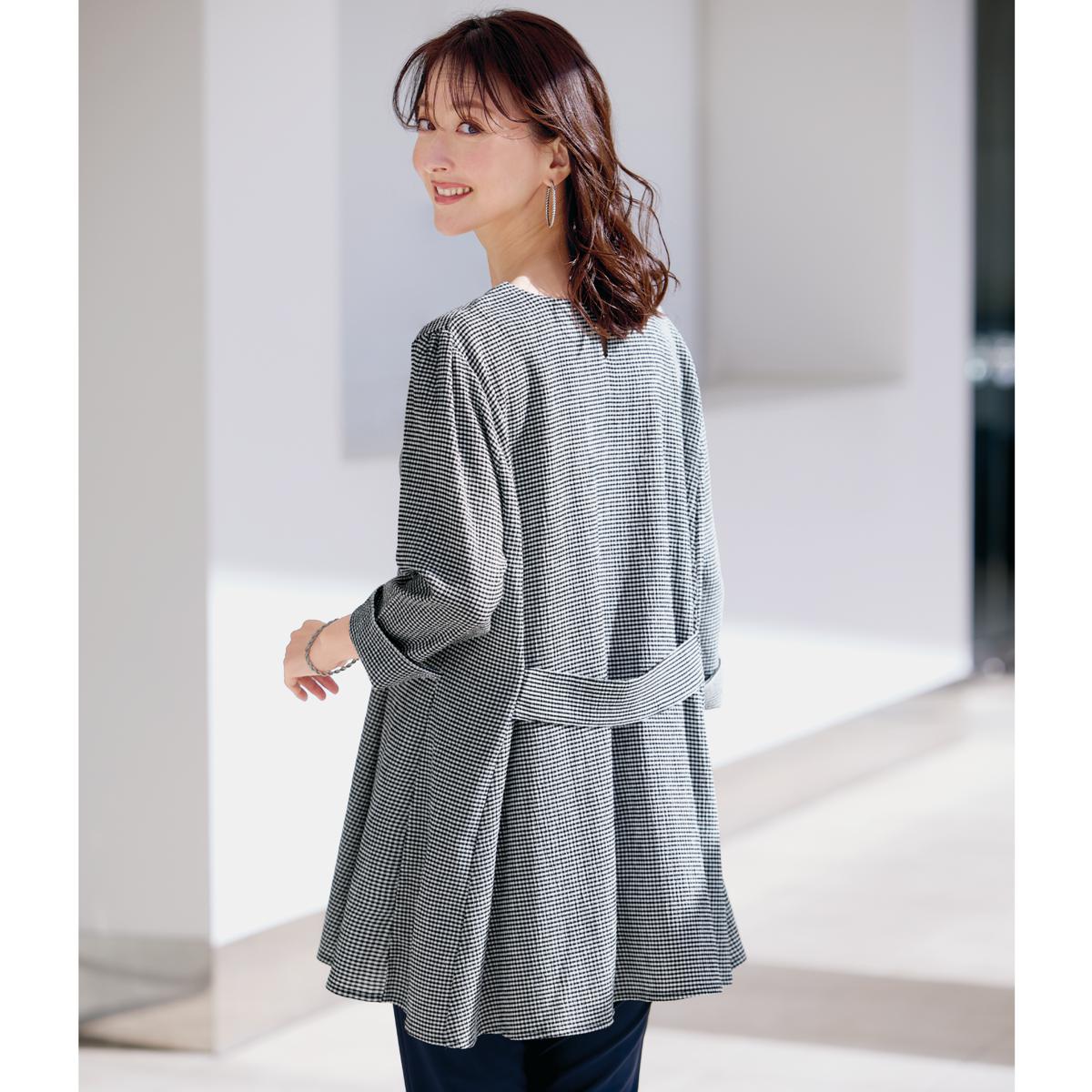 シボ感のあるギンガムチェック生地は快適な着心地で、パネル切り替えのフレアシルエットが弾むように軽やか。ーデザインー袖口スリットや後ろのベルト使いがおしゃれ見えポイント。のびるループのボタン仕様で着脱しやすい。