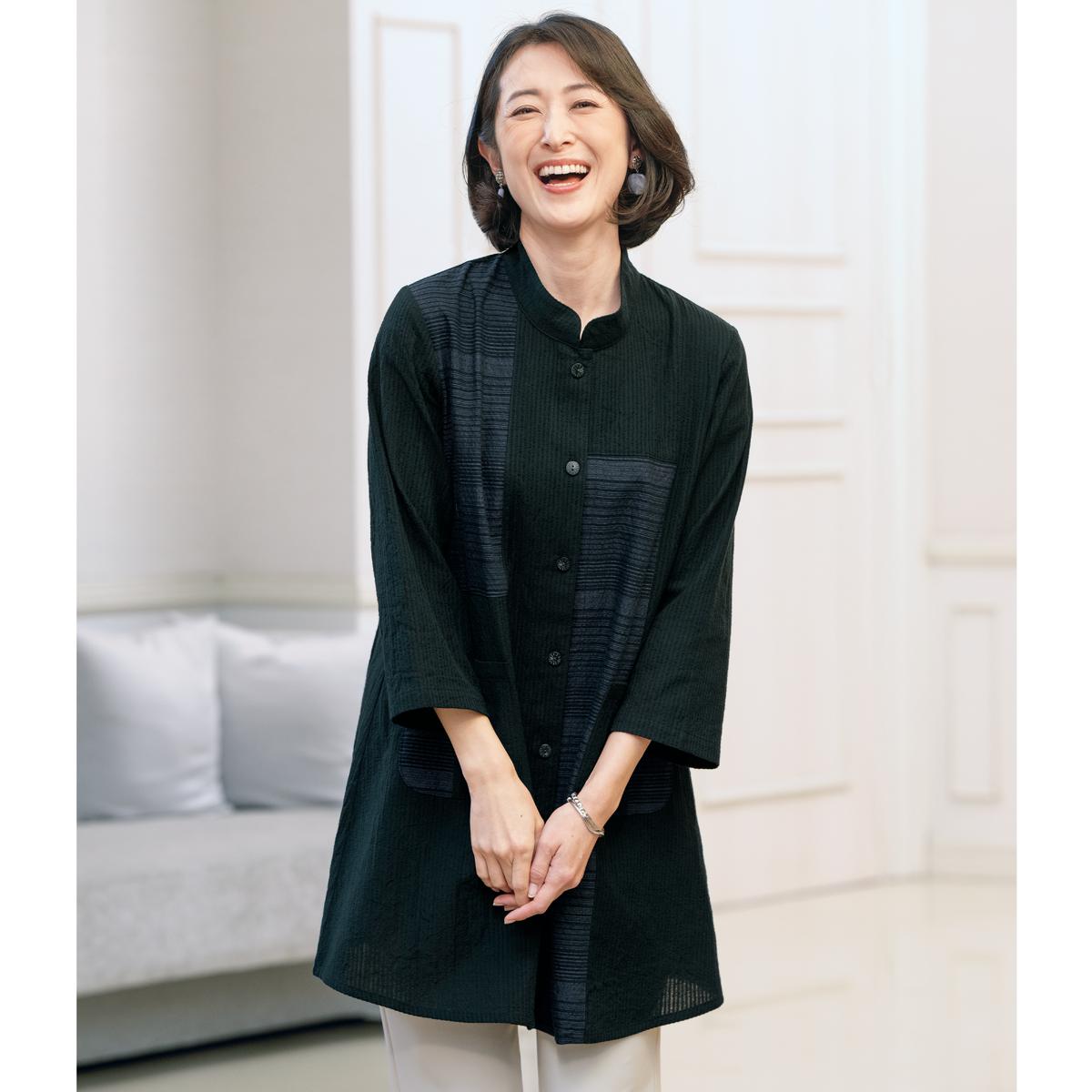 二色の生地を使ったアシンメトリーな切替えが、エレガントな雰囲気を演出。スタンド襟で顔周りがすっきりとし、着るだけでこなれた装いになる一枚です。ー素材特性ー羽織りとしても使えるほどよい厚みのさらっとした綿素材。ーデザインー左右にポケット付き。