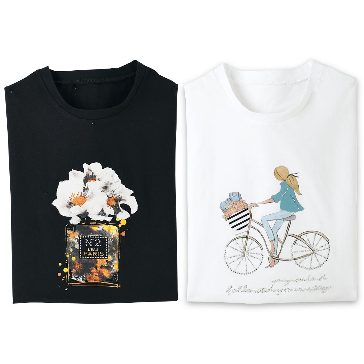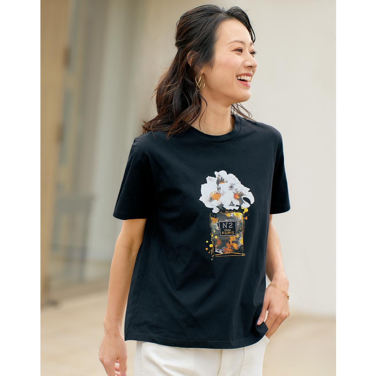 黒と白で異なるイラスト柄プリントのコットン混Tシャツ。それぞれに繊細なビジューがきらめいて、夏カジュアルを爽やかに演出してくれます。1枚当たり約2,745円(税込)。ー素材特性ー薄手でなめらかな風合いの綿混素材。