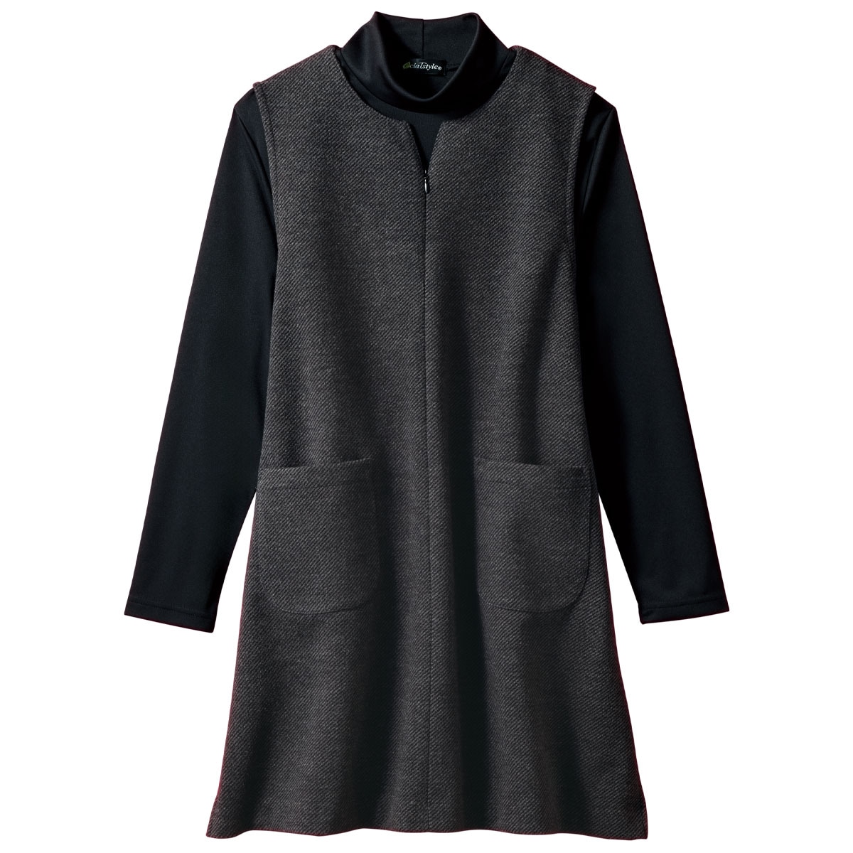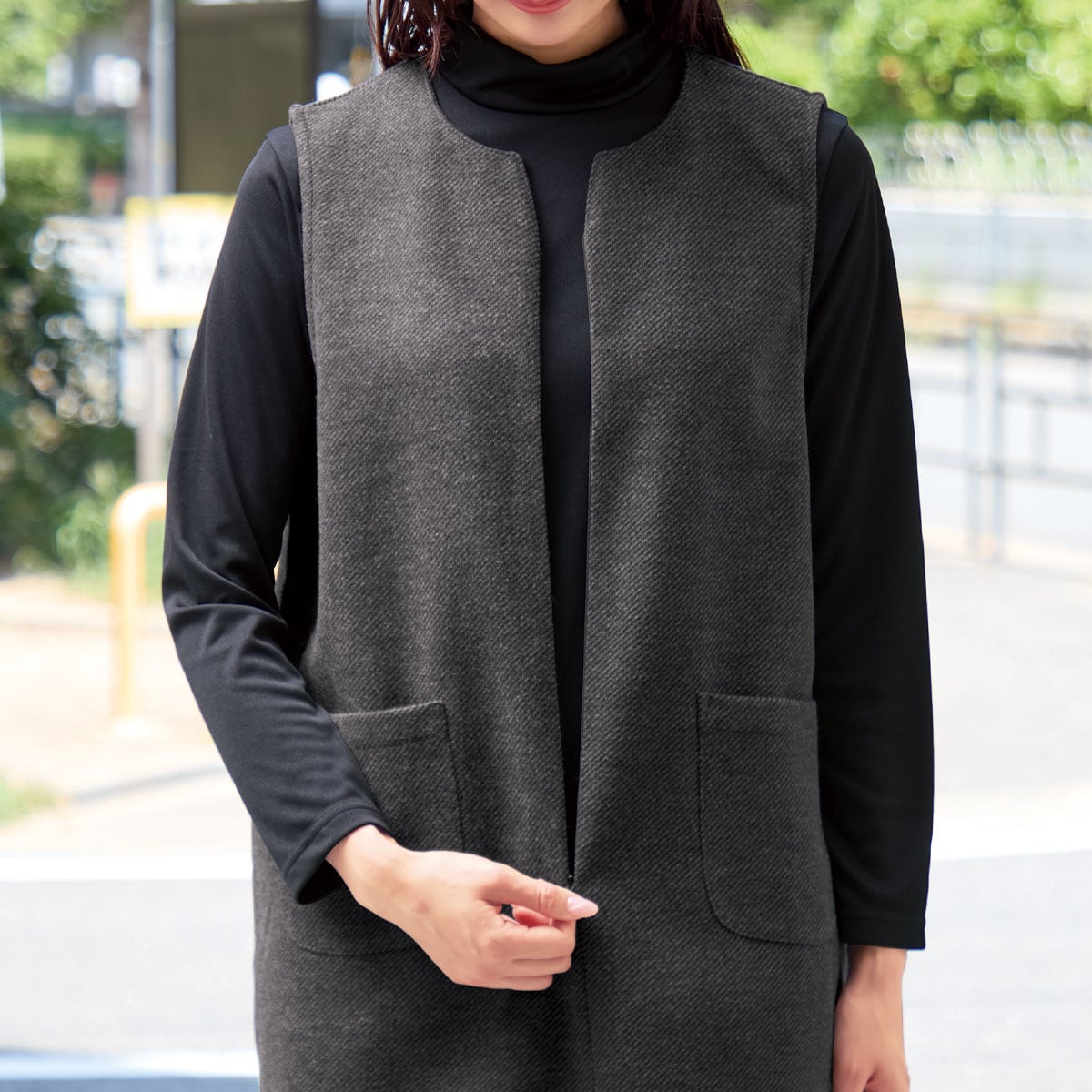 表面感のある優しい風合いの杢調素材を使用。ふんわり軽やかな国産ロングベストです。タートルネックやロングTシャツと重ね着すれば、簡単に上品スタイルが完成。ーデザインーキーネックデザインがすっきりをおしゃれな雰囲気を演出。腰や背中をすっぽり包むロング丈。前ファスナーだから着脱簡単、大きめポケット付き。ー素材特性ー微起毛でやや厚みのある素材を使用。