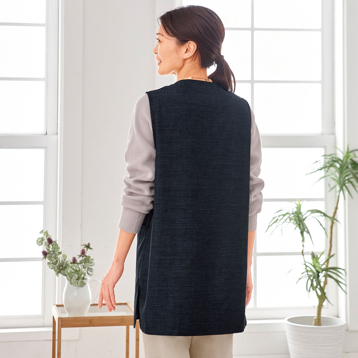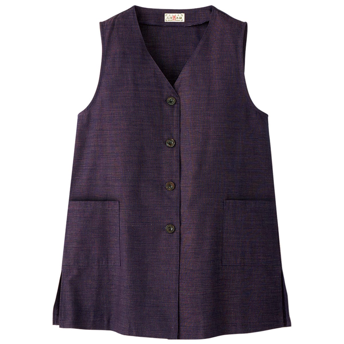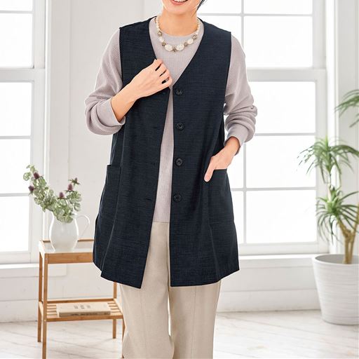 前ボタンで着脱らくちん。軽くて体型カバーもできる三河木綿のロングベスト。