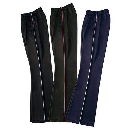 引き締まって見えるカラーとサイドラインですっきり美脚見せ。1本あたり約1,994円(税込)のお得な3色組ラインパンツです。ーデザインーウエストは総ゴム仕様でラク!背中が見えにくい股上深め設計。裾にはスリット入り。