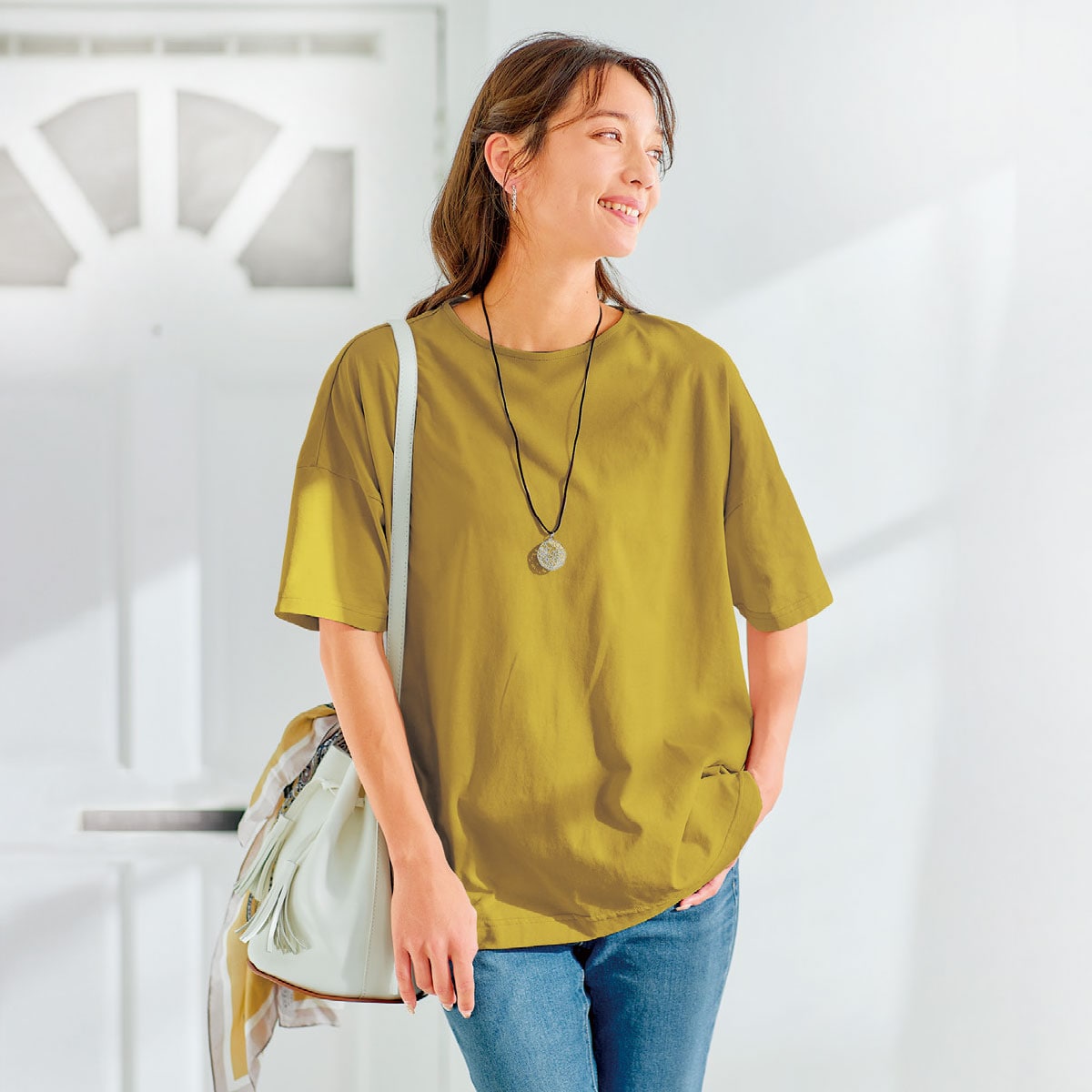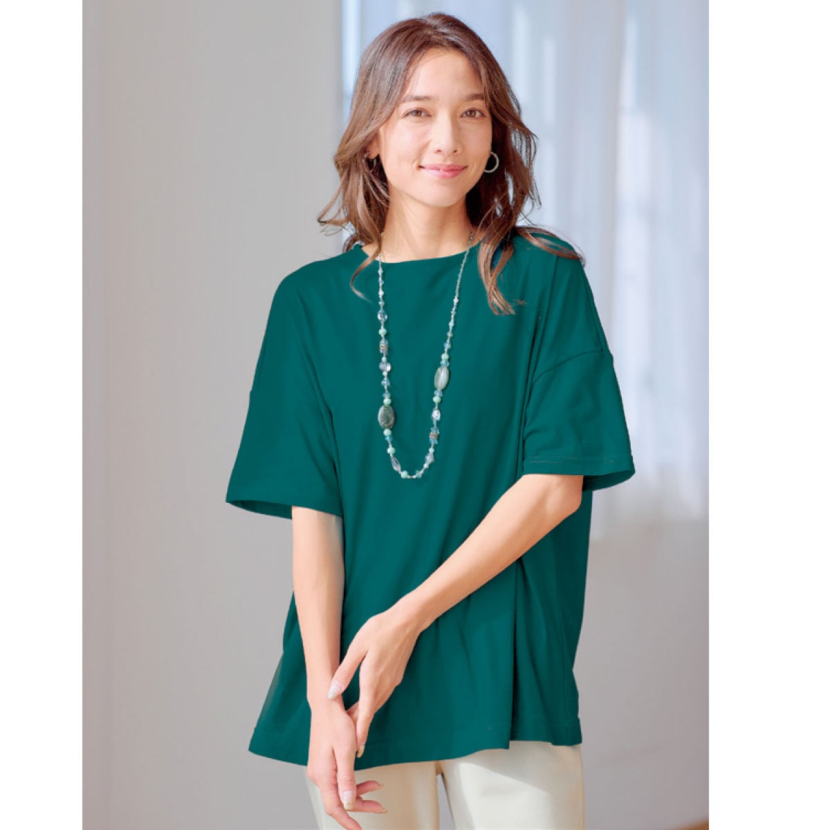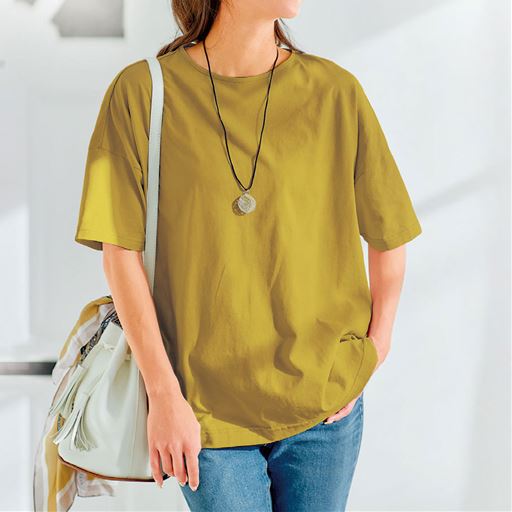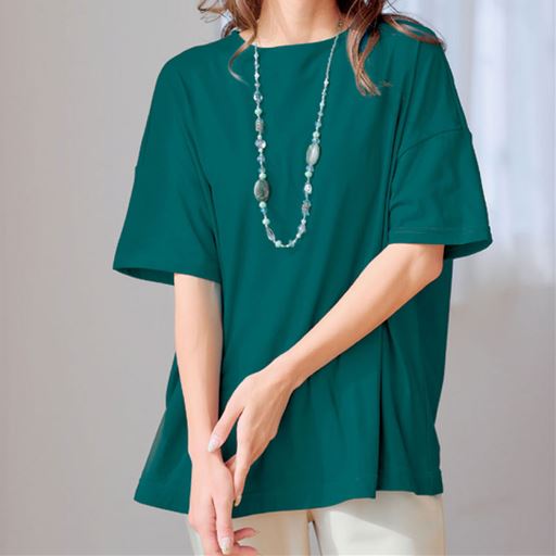 ゆったりした着心地で体型カバー!ー素材特性ー肌触りはさらさらと清涼感があり、UVカット加工で紫外線対策にも!「MULTIEFFECT®」汗染み防止加工で汗染みが目立ちにくい!汗を吸い込み、素早く乾かすことで汗染みを目立ちにくくします。さらりとした肌触りで着た瞬間ひんやりします。【汗染み防止】【吸水速乾】【接触冷感】【UVカット率約98%】