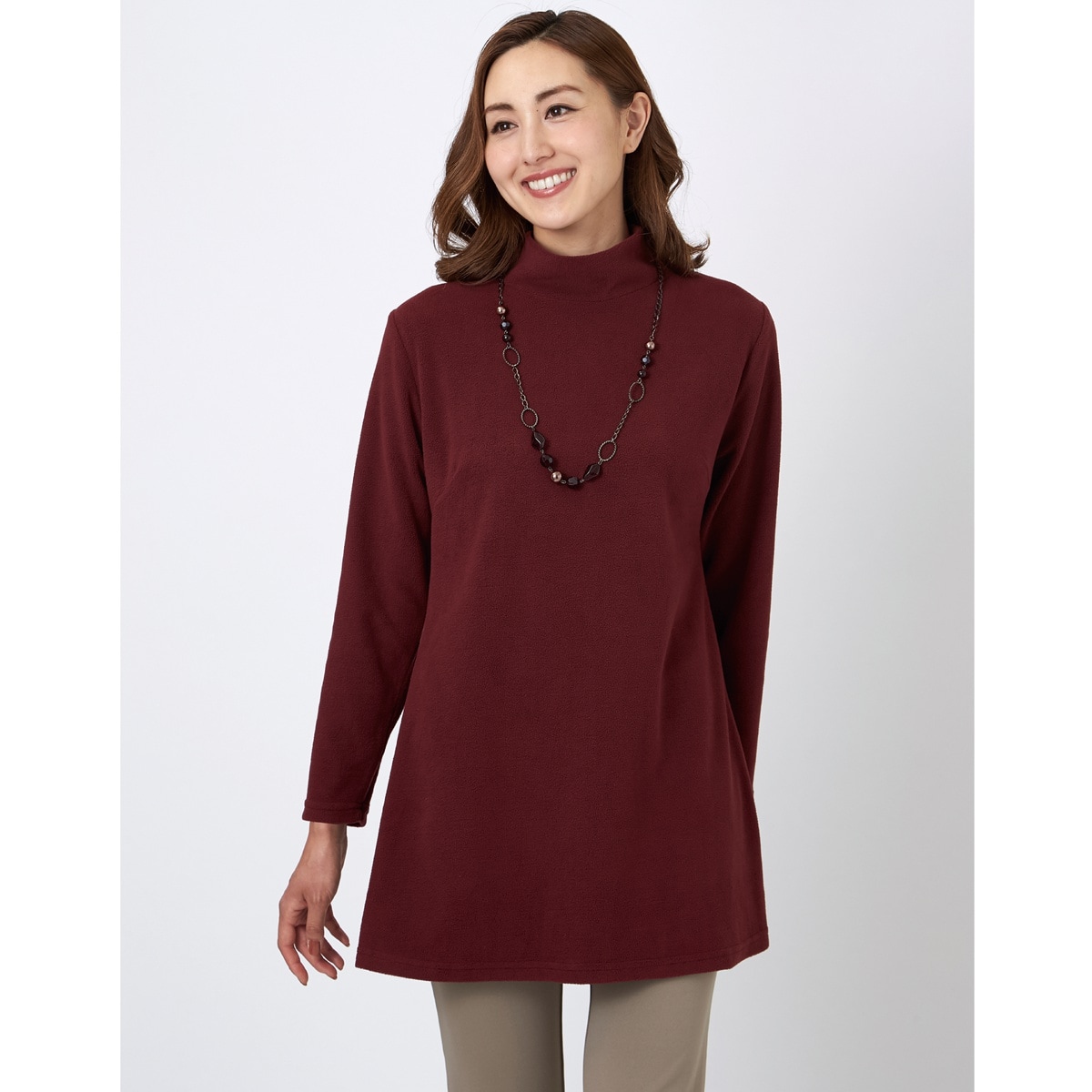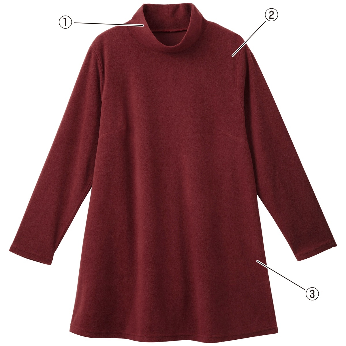 ワイン (1)ハイネックで首元暖か (2)上着を羽織っても着ぶくれしない薄めのフリース素材 (3)ボディラインをゆったり包むAライン