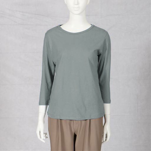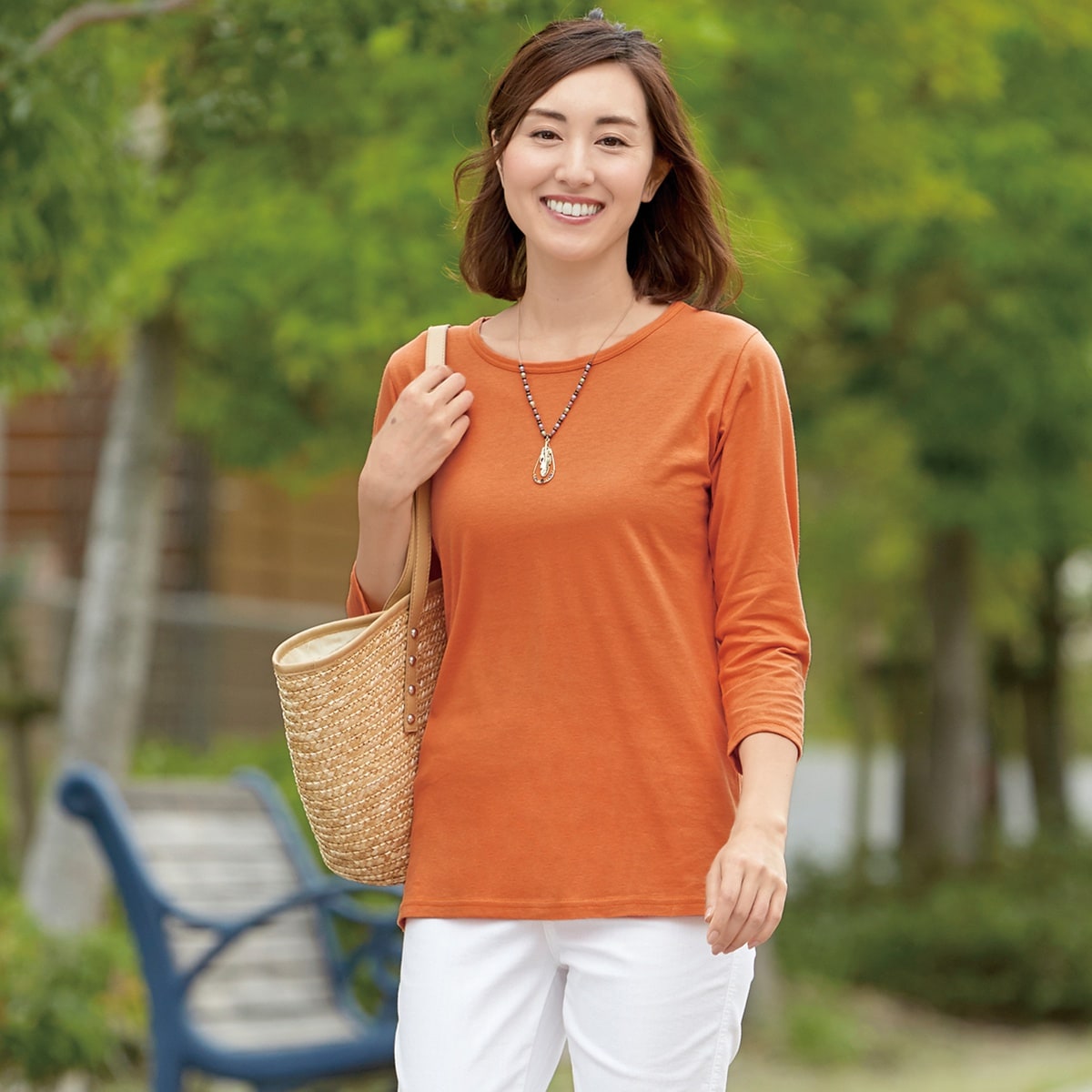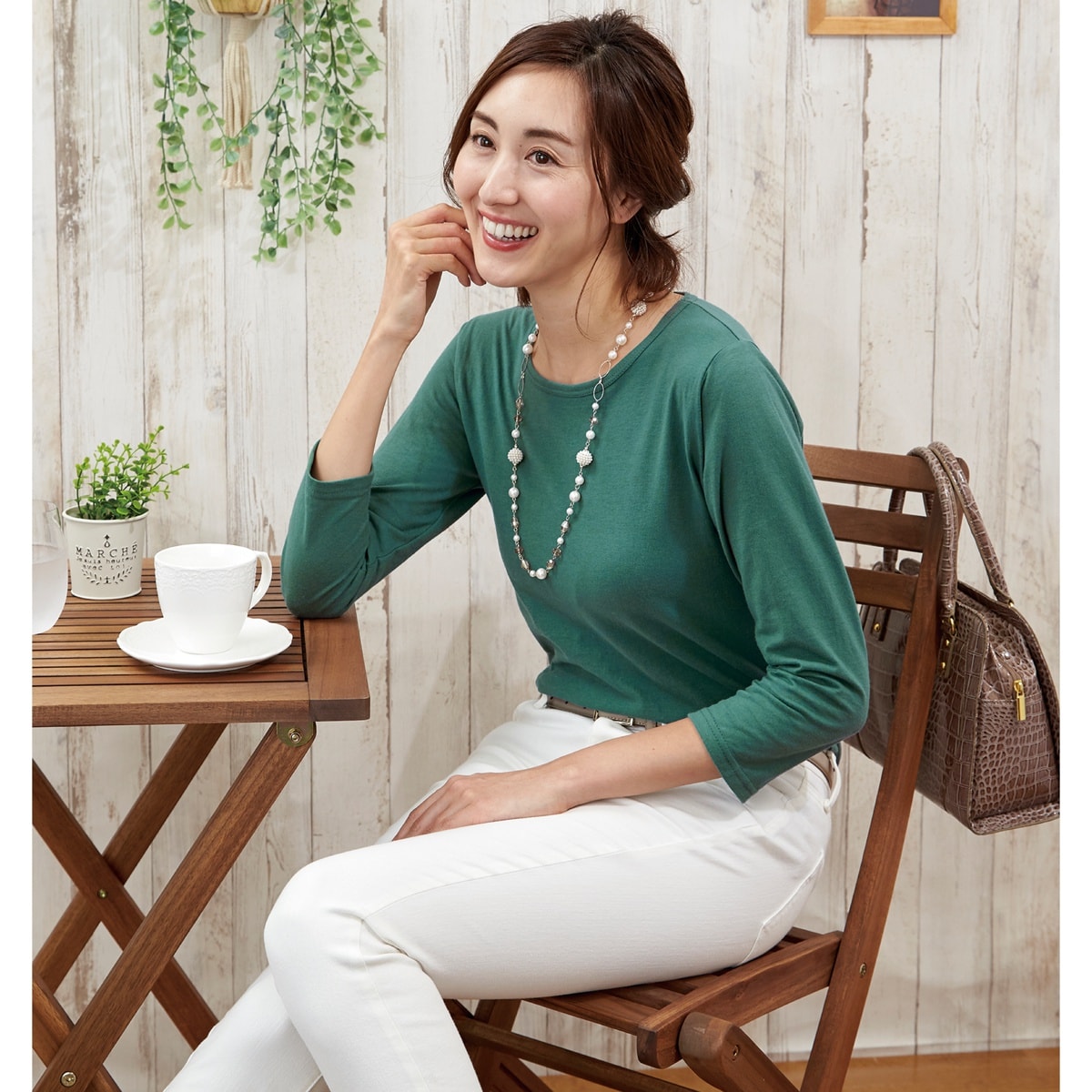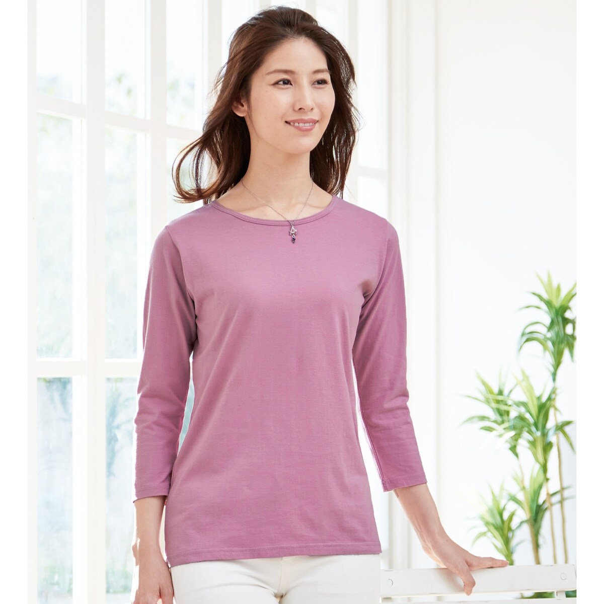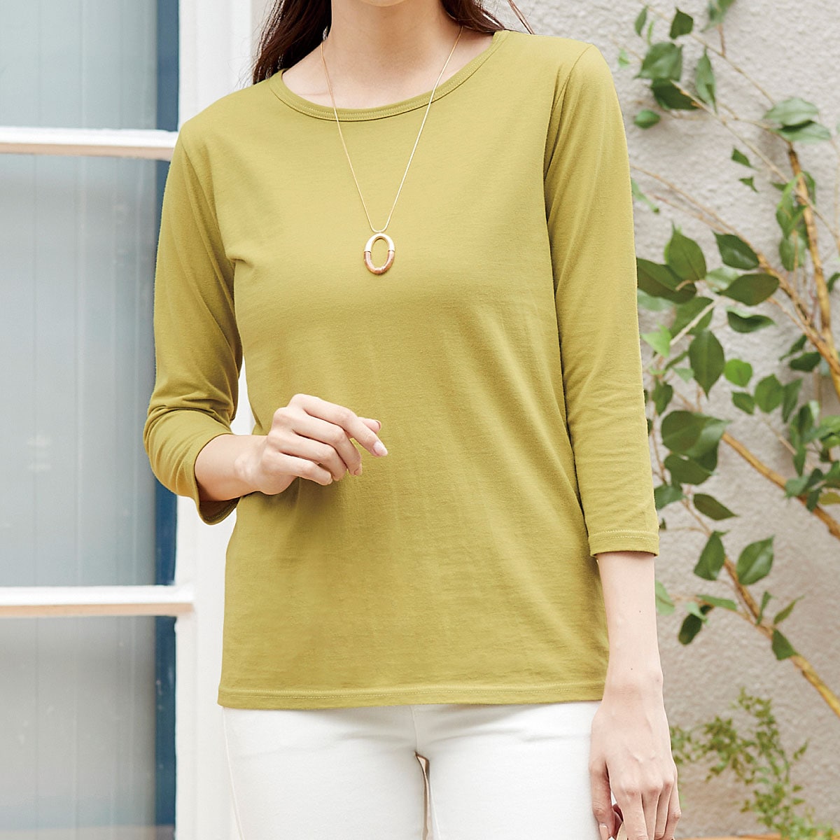 色合い・素材・着心地と三拍子揃ったベーシックTシャツです。普段使いにもお出かけにも合わせやすい。ーデザインー気になる二の腕をきれいに見せる7分袖。鎖骨をきれいに見せるネックラインで、手を上げてもおなかも背中も出ない丈感なのも嬉しいポイント。ー素材特性ー洗っても型崩れしにくい素材。糸を「S撚り」と「Z撚り」を互い違いにすることで、型崩れしにくくなります。