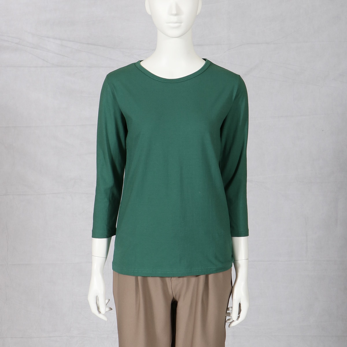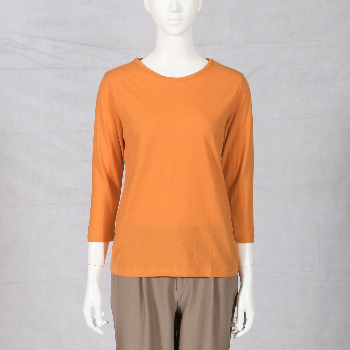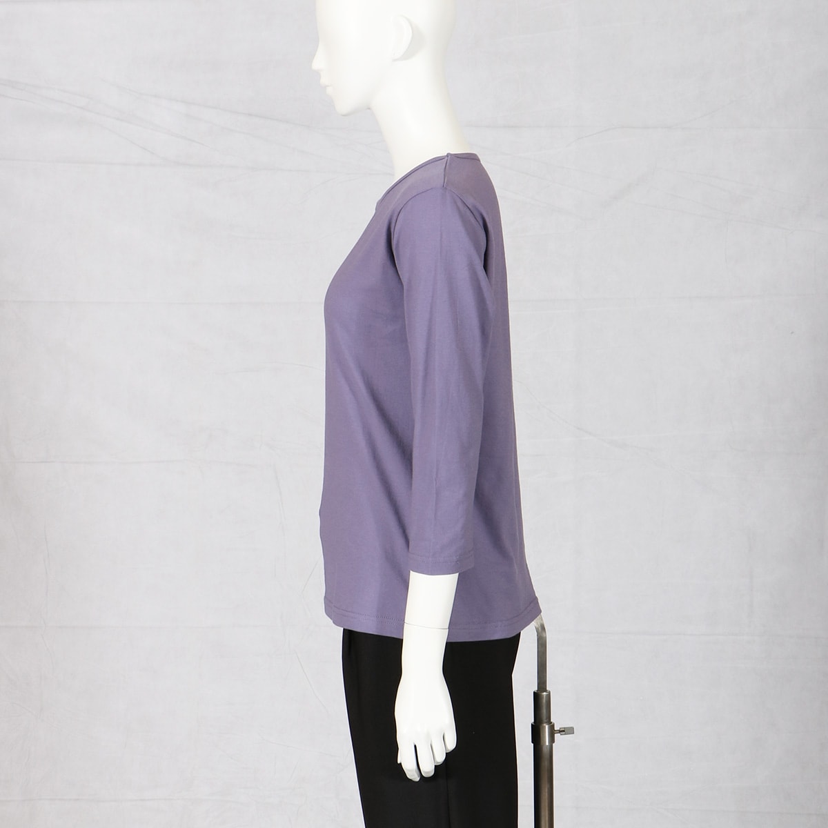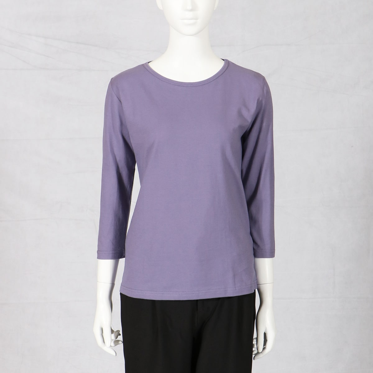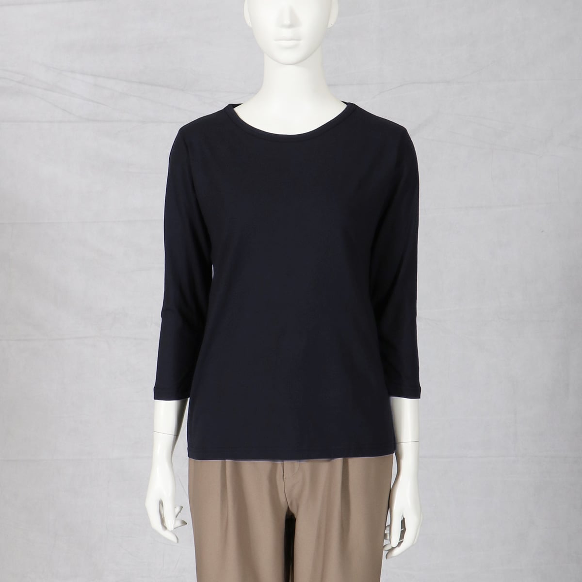 色合い・素材・着心地と三拍子揃ったベーシックTシャツです。普段使いにもお出かけにも合わせやすい。ーデザインー気になる二の腕をきれいに見せる7分袖。鎖骨をきれいに見せるネックラインで、手を上げてもおなかも背中も出ない丈感なのも嬉しいポイント。ー素材特性ー洗っても型崩れしにくい素材。糸を「S撚り」と「Z撚り」を互い違いにすることで、型崩れしにくくなります。