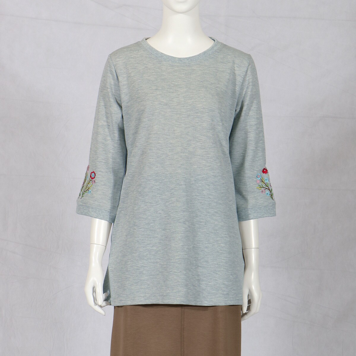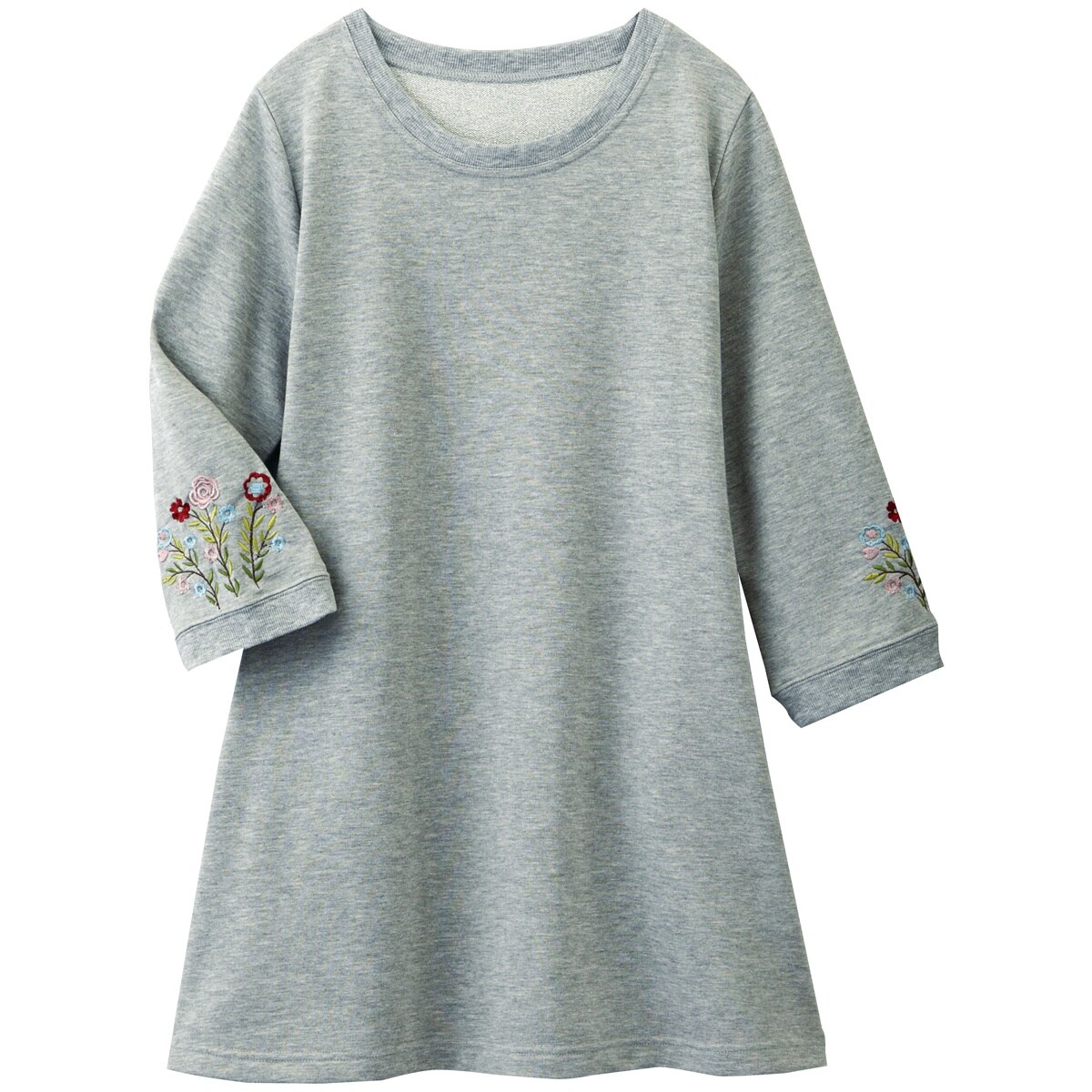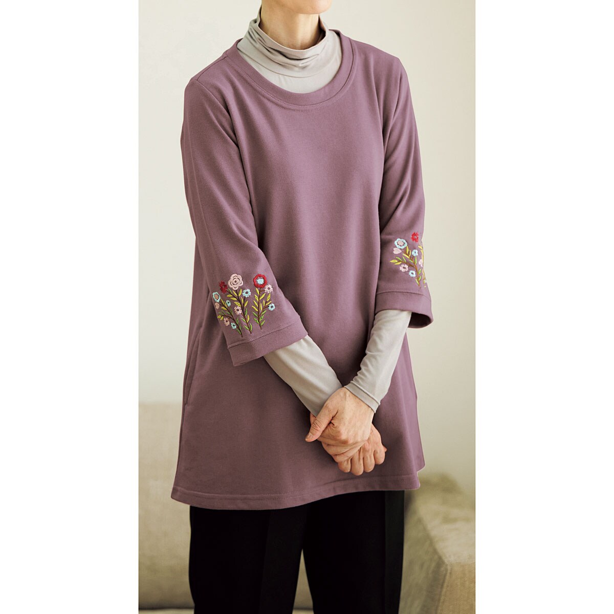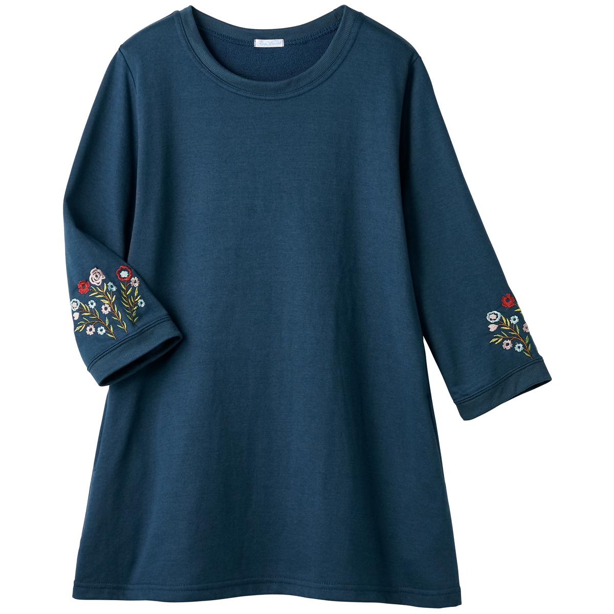 愛用者多数の人気チュニックは、袖の花刺しゅうが優しい雰囲気