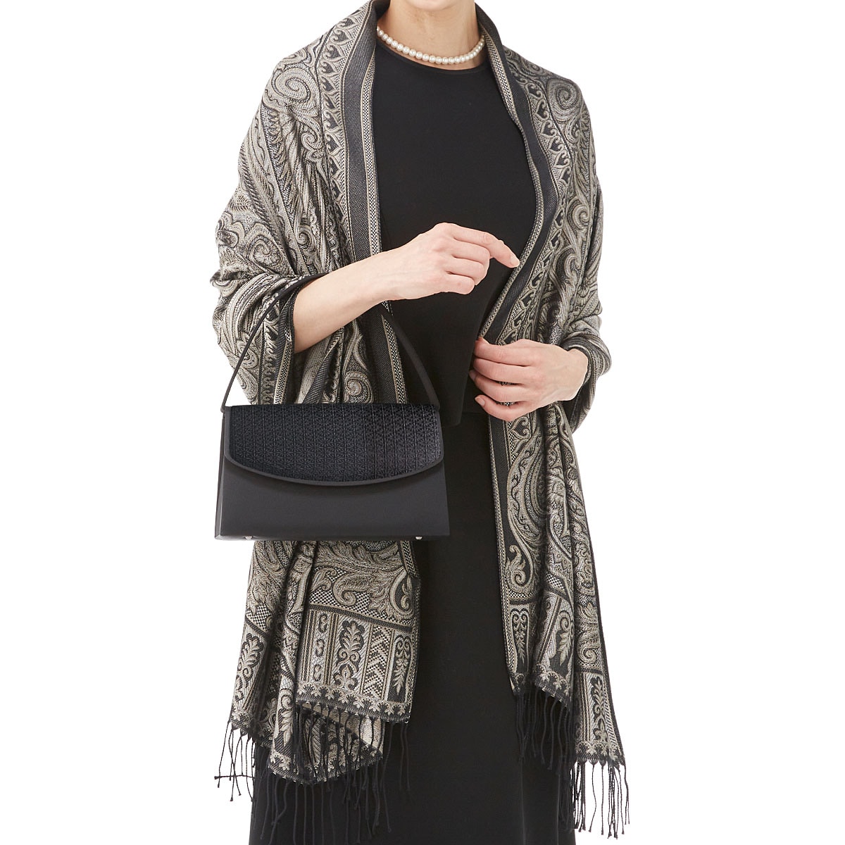 シルク独特の光沢感とやわらかな質感の国産ストール。合わせやすい色合いで、弔事の席ではもちろん普段使いでも重宝します。