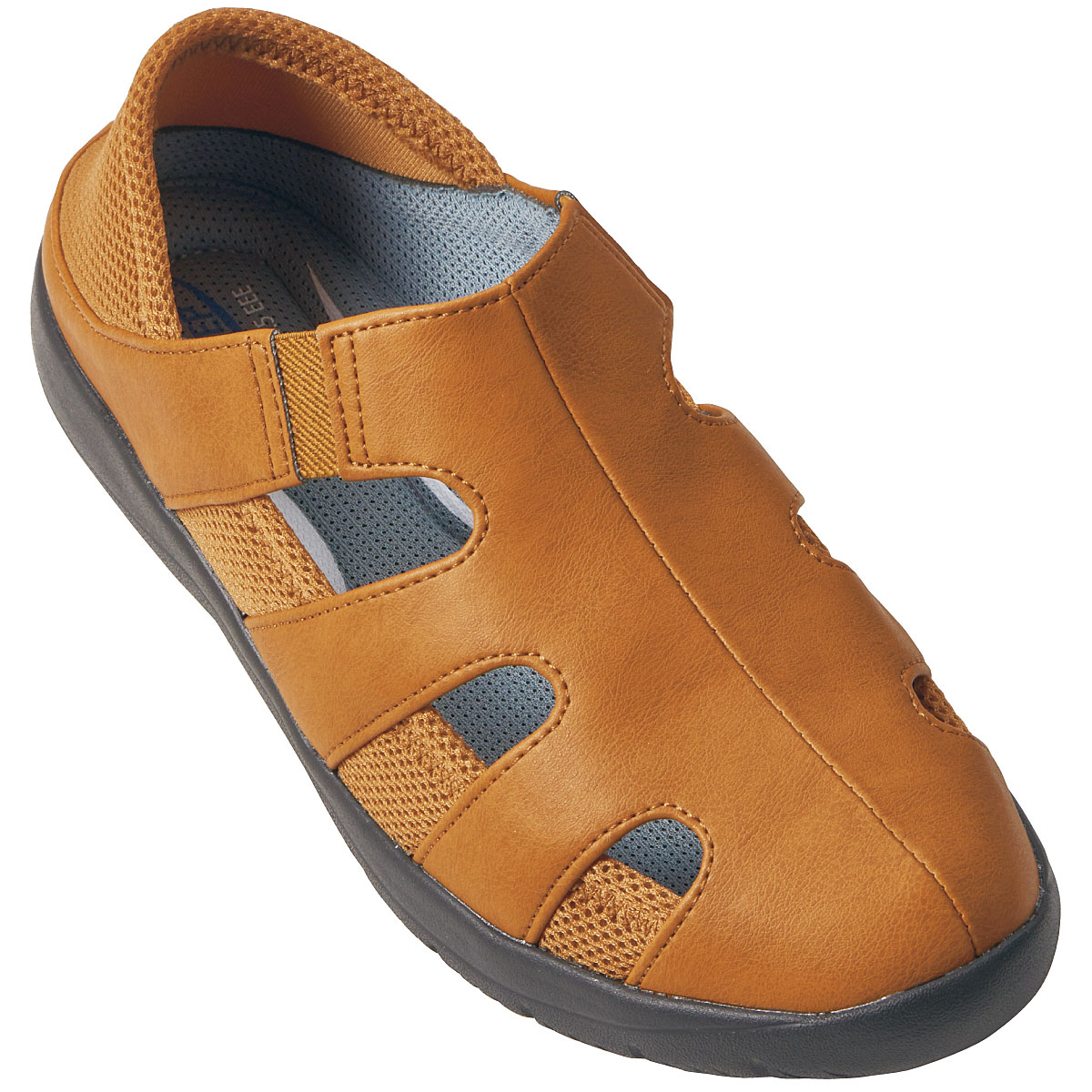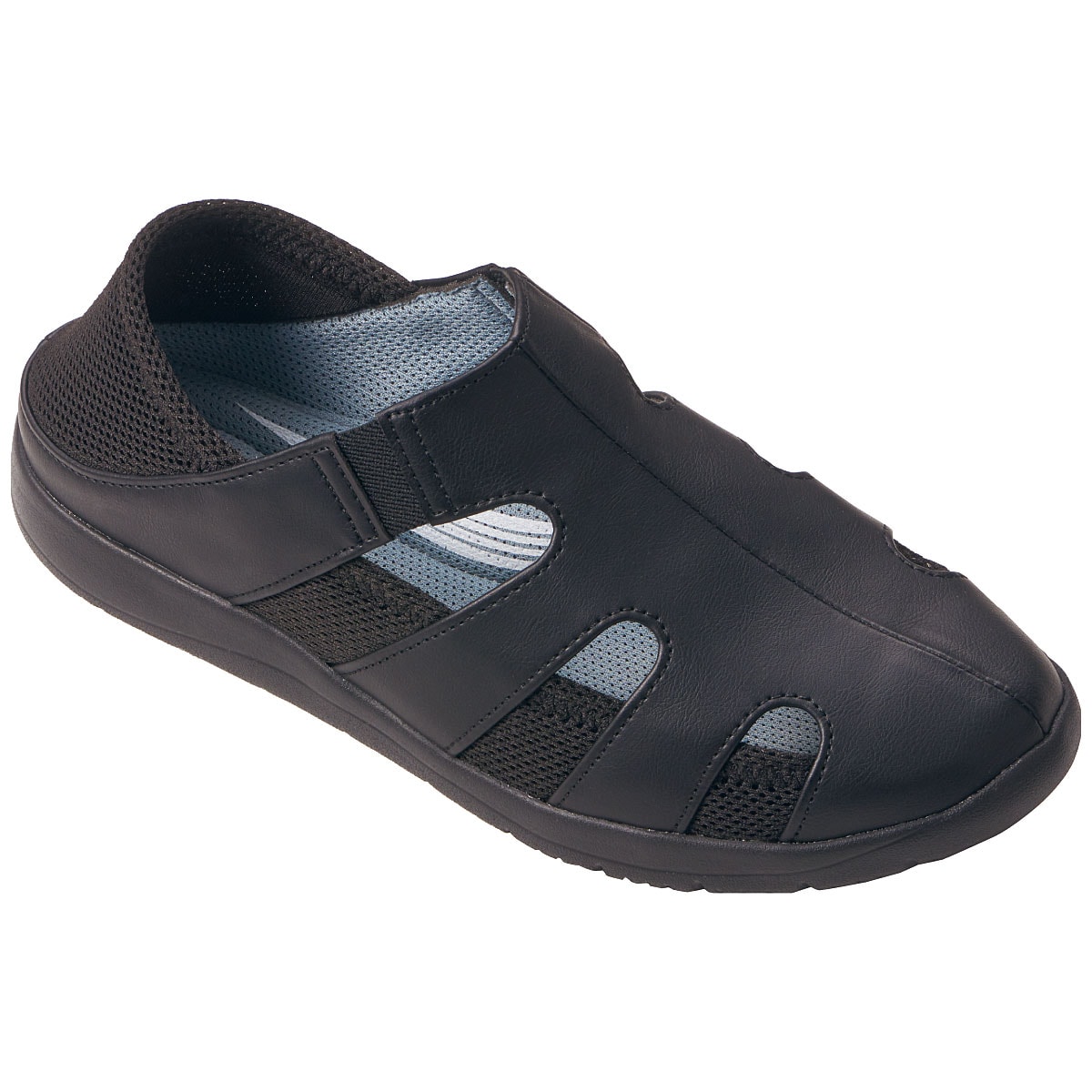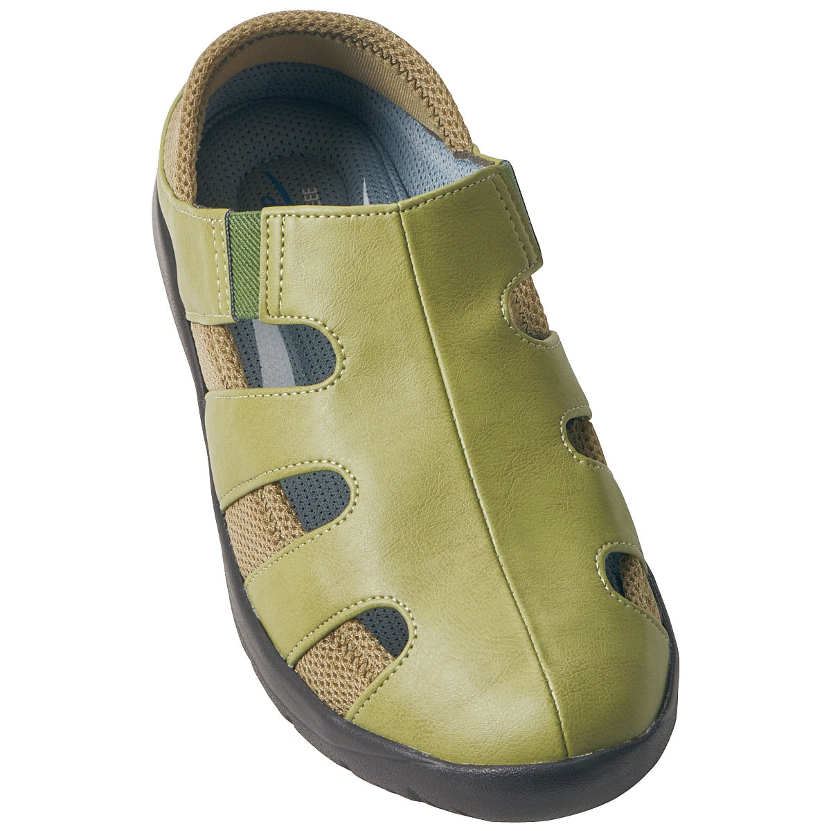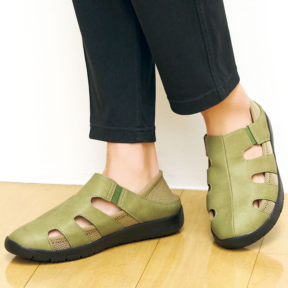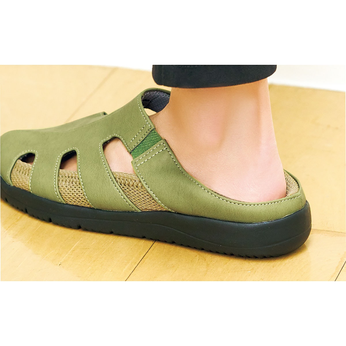 甲を深く覆っているのでパカパカせず、伸縮性のあるメッシュ生地がかかとに優しくフィット。かかとのメッシュ部分を踏んでサボ風にも使用できます。-デザイン-履き口両側にゴム素材を使用し脱ぎ履きしやすい。土踏まずのアーチをサポートし、かかとを包み込むU字型クッションの中敷。抗菌効果も。