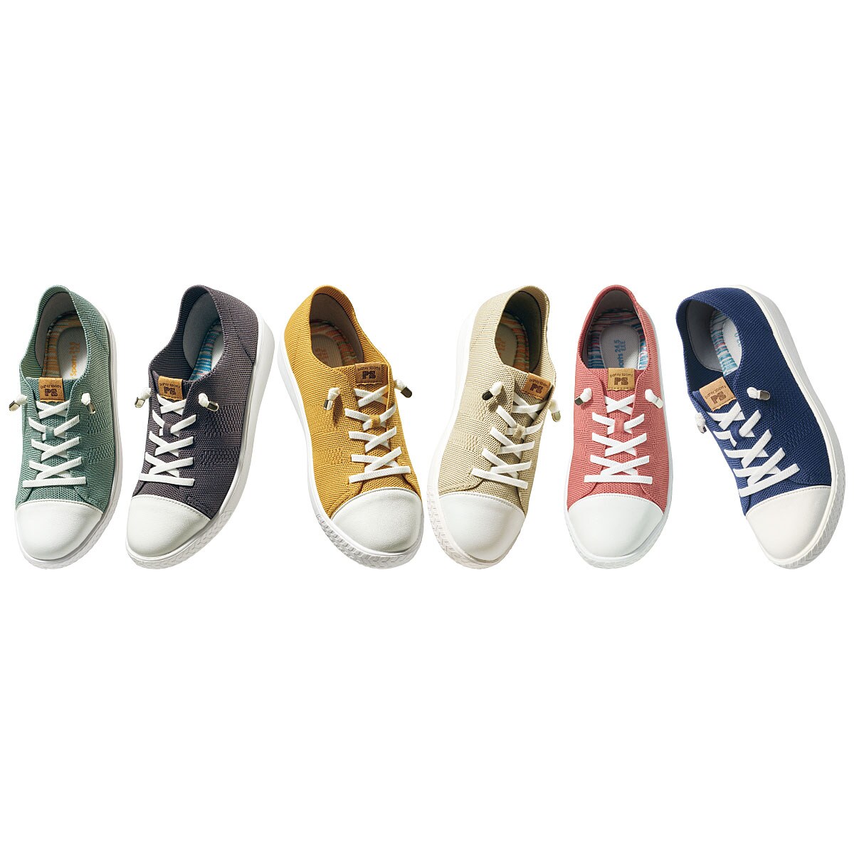 足元を明るく彩るカラフルなソフトニットスニーカー。夏もスニーカーをはきたいけど、暑いのは苦手という方にもおすすめ!汗・ムレが気になる季節でも快適に過ごせます。ーデザインー伸縮性のあるゴム素材の靴紐で、スムーズに脱ぎはきできます。ー素材特徴ー足裏への衝撃を緩和するU字型アーチクッションを採用し、長時間はいても疲れにくい。【軽量約160g(23cm片足)】【抗菌防臭(中敷)】