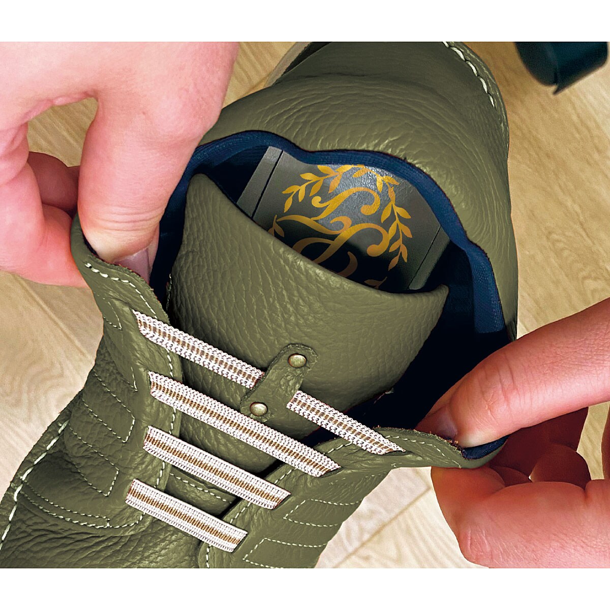 (1)ヒモは伸縮性のあるゴムだから脱ぎはきラクラク。