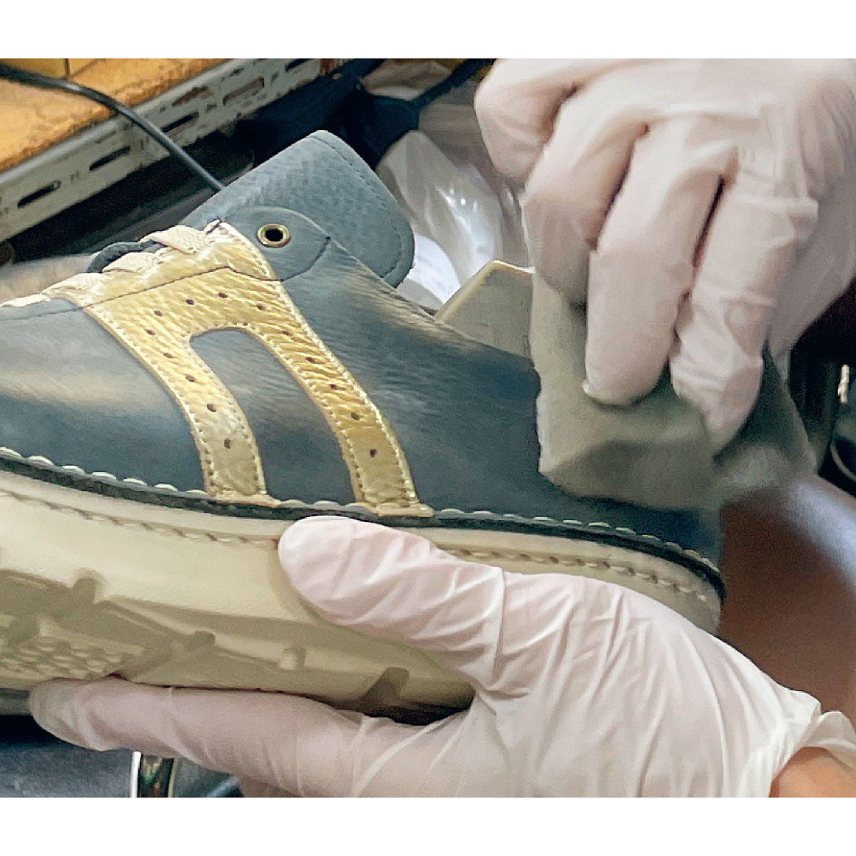 (3)クリームを塗り込み、牛革の艶と柔らかさをキープ。