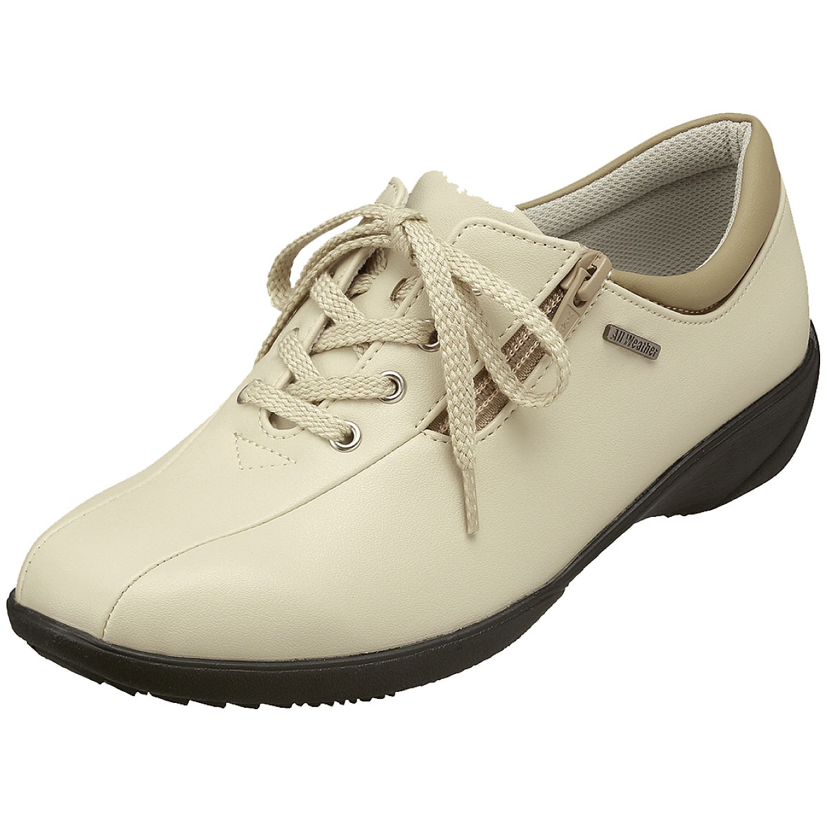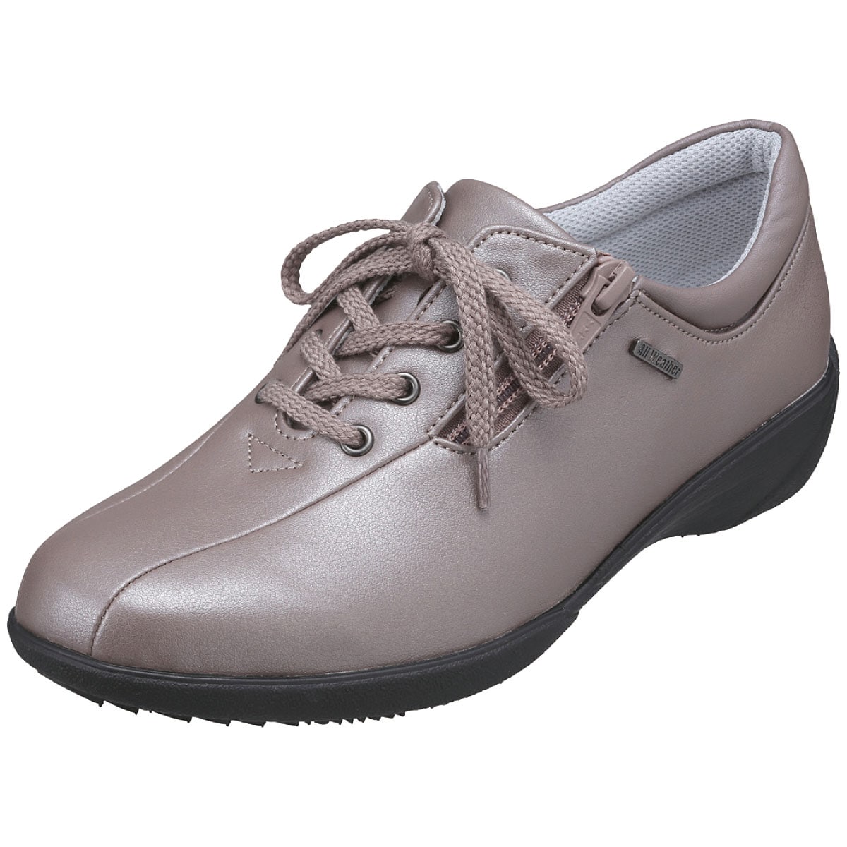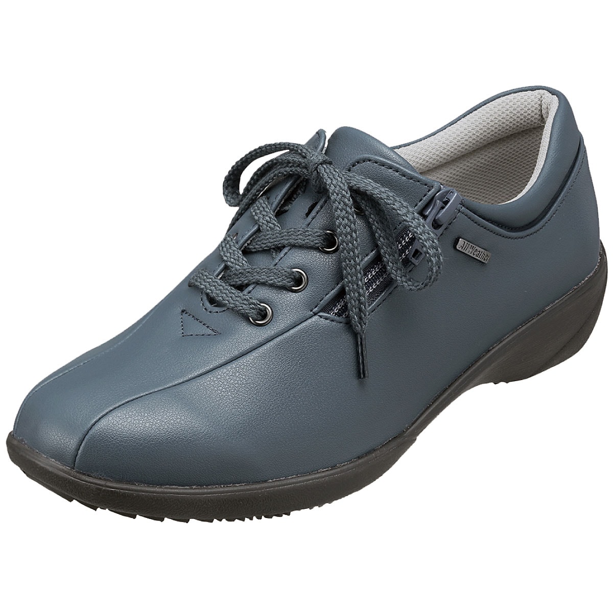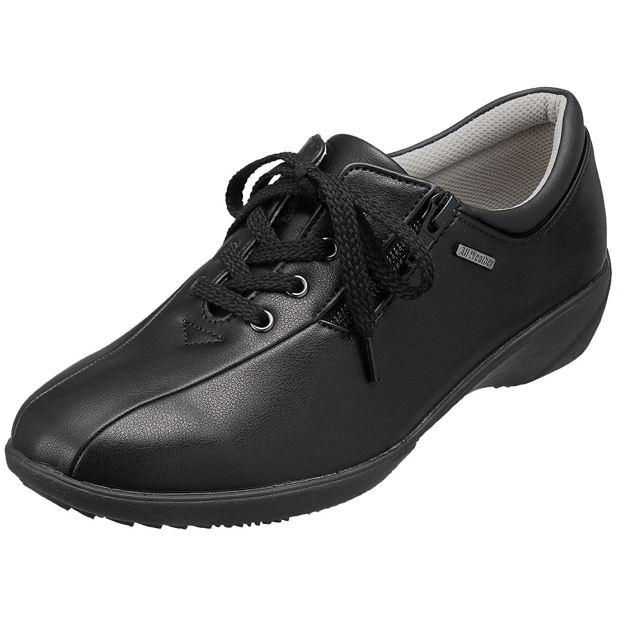 シンプルなデザインで合わせやすく、天候やシーズンを問わずお出かけが楽しめるシューズ。スニーカー感覚で軽やかに歩けます。ーこだわりPOINTー甲外側ファスナーと内側ゴムで脱ぎはきラクチン。抗菌加工を施したさらっとしたメッシュ素材の中敷で爽やかなはき心地。靴底の一部にグリップ性のあるゴムを使用し、安定歩行をサポート。かかと部分には足あたりが優しいかかとクッション付き。【生活防水】【軽量約170g(23cm片足)】【抗菌(中敷)】