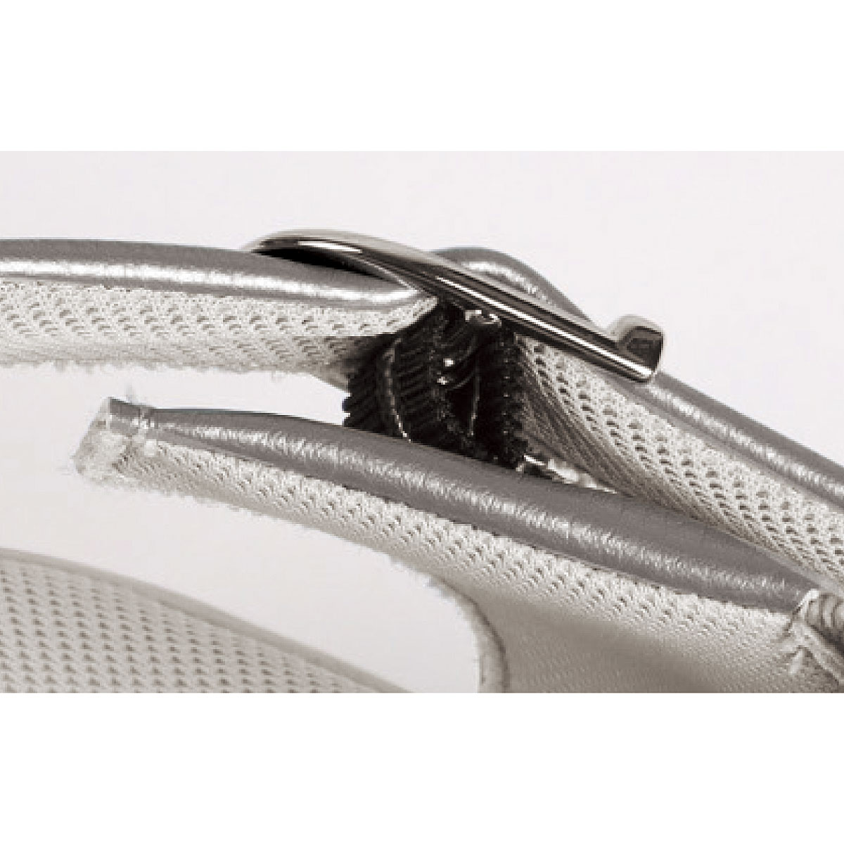 シルバーベルトバックル内側の隠しゴムで脱ぎ履きしやすい。