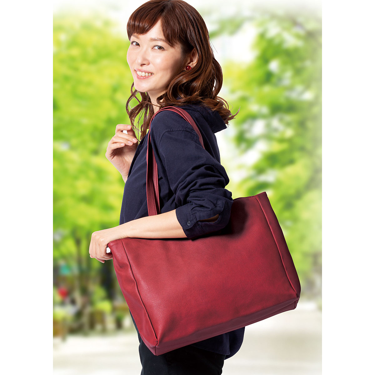 ■素材/[表地]合成皮革 [裏地]ポリエステル ■サイズ(約cm)/[本体]縦28×横36×マチ13 [持ち手高さ]28 ■重量/約300g ■仕様/[開閉]ホック式 [内側]オープンポケット×2 [外側]ファスナーポケット×1●中国製