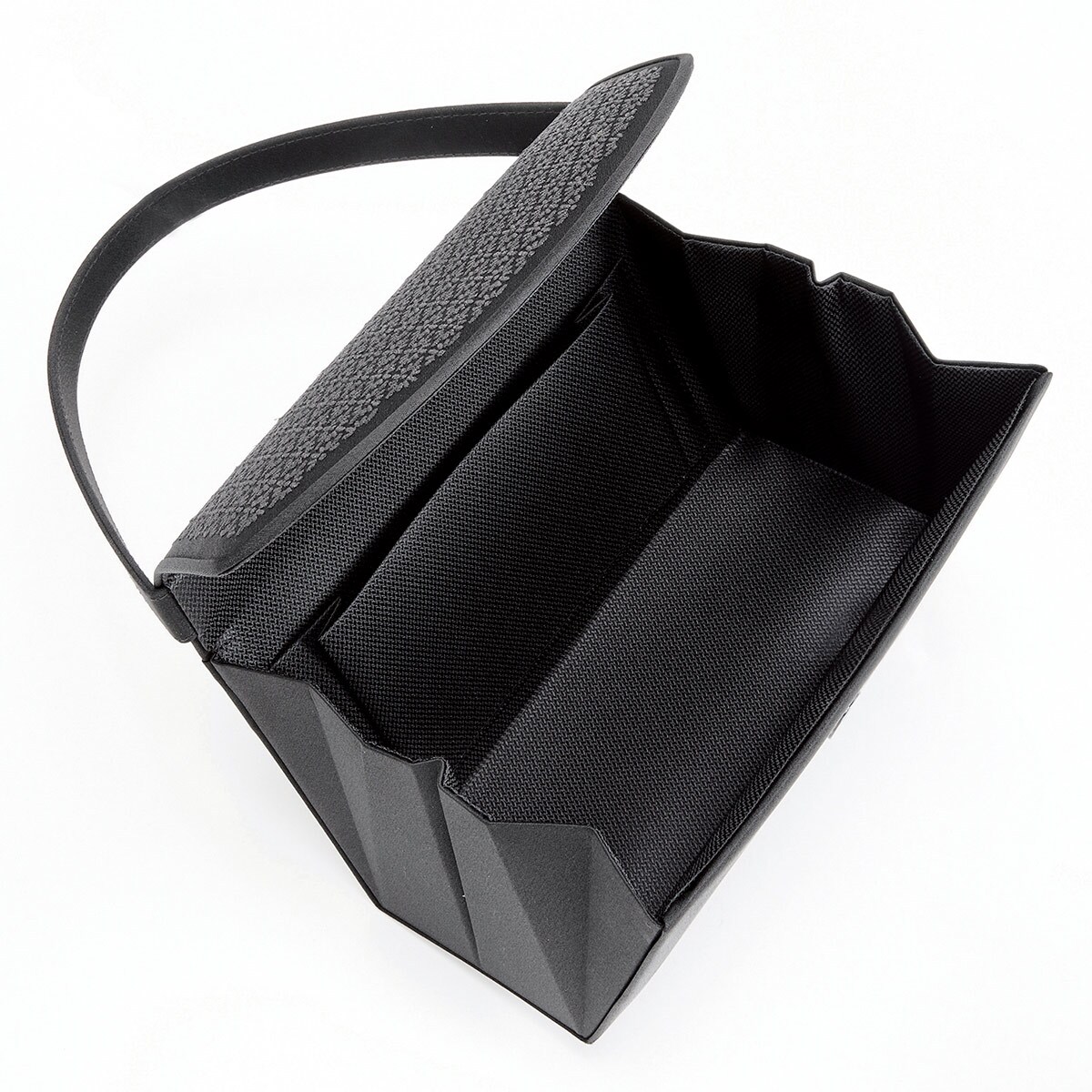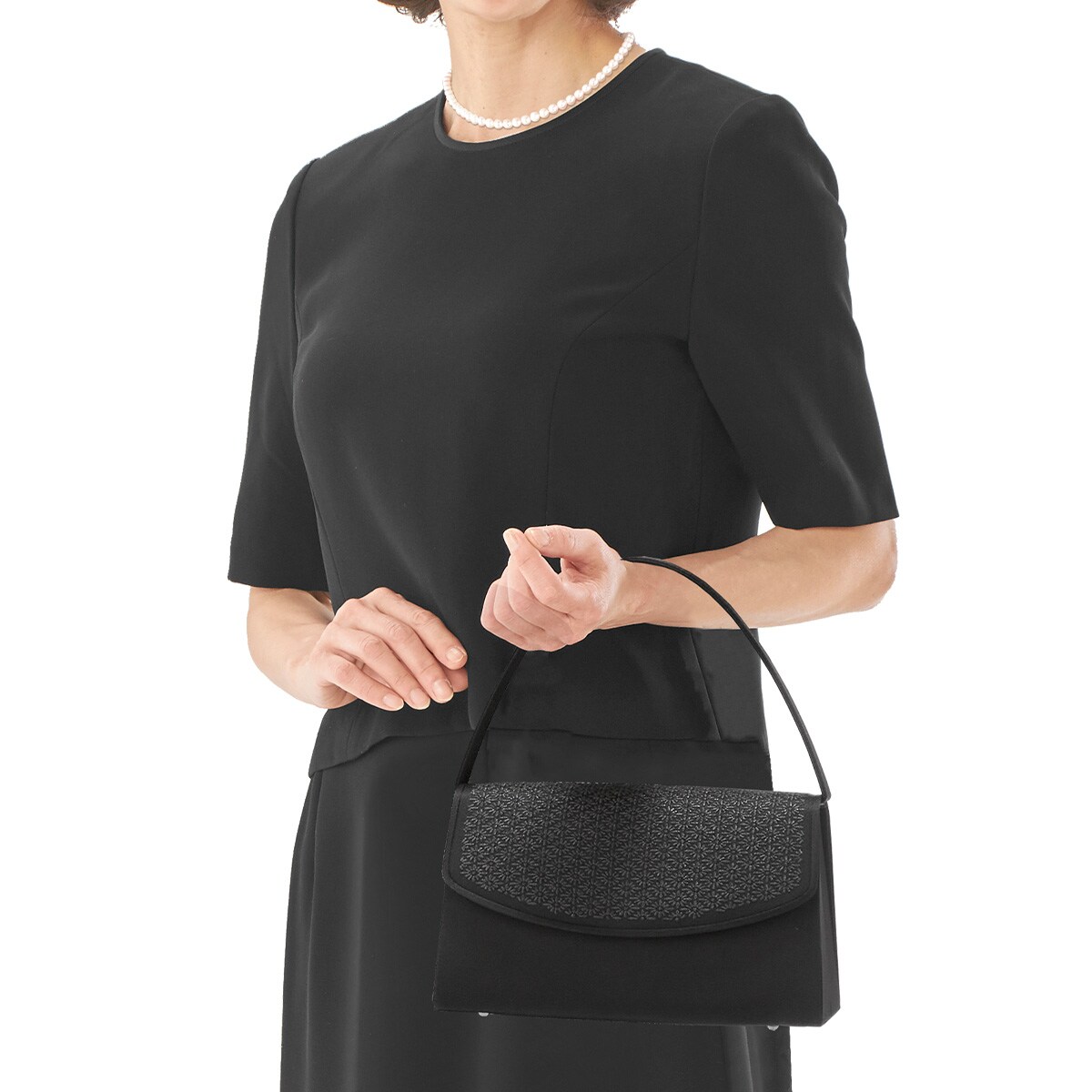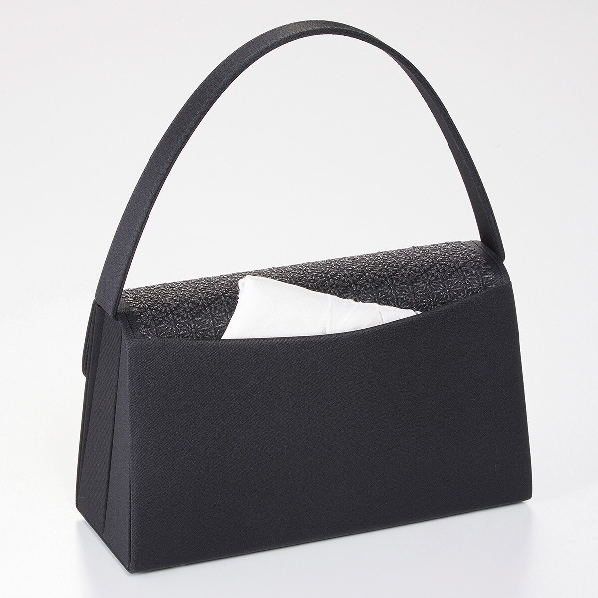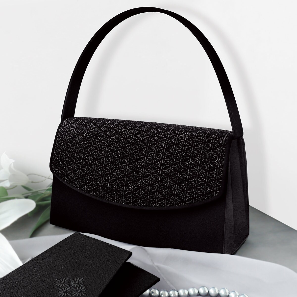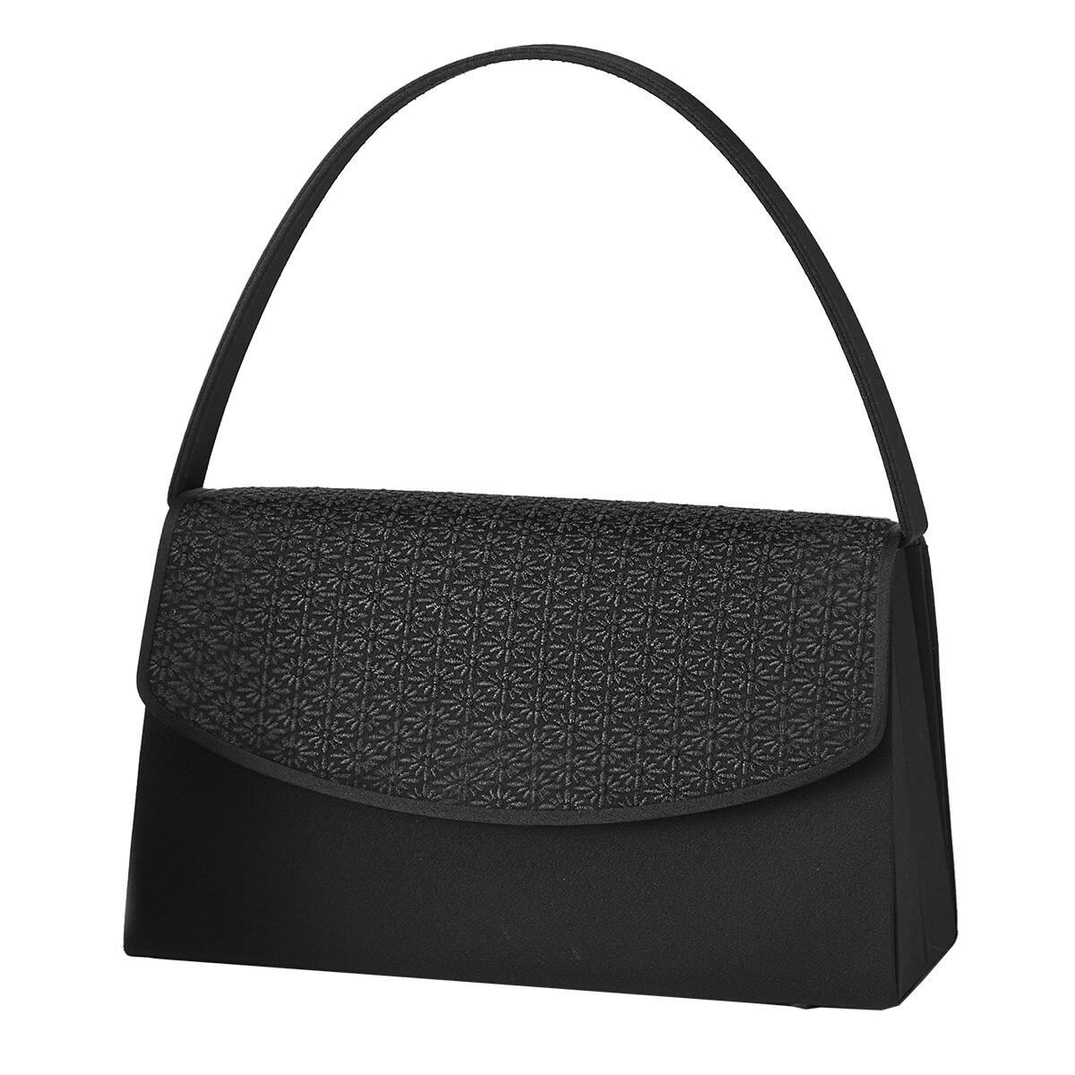 ーデザインー凛とした上品さが漂う菊菱柄で、菊は花の中でも一番位が高いとされ、その気高さから邪気を払うとも云われています。その菊の花をモチーフに、厳かな席に合う上品なデザインに仕上げました。刺繍には漆加工糸を使用しています。~漆加工糸とは~漆を和紙に塗り、細く一定幅に切ったものを撚り巻いた黒光沢のある糸のことで、元は着物などの装飾に用いられていました。黒色の漆は「漆黒」と言われ、他の塗料では出す事ができない深みのある黒色が特徴。喪の席に相応しいフォーマルアイテムです。■素材/[表地]ポリエステル [刺繍]漆加工糸■サイズ(約cm)/幅24×高さ14×マチ9.5■持ち手高さ(約cm)/13.5■重量/約295g■仕様/[開閉]かぶせマグネットホック式 [内側]オープンポケット×1 [外側]オープンポケット×1●日本製