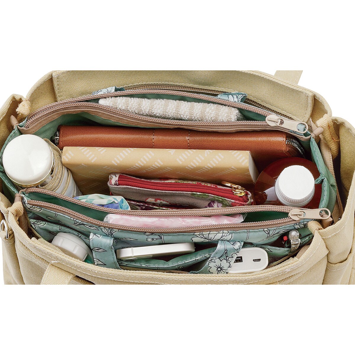 カバンの中が6つのポケットですっきり整頓!使いやすい自立タイプで、おでかけカバンにもおすすめ。ちょっとしたおでかけカバンにもおすすめ。