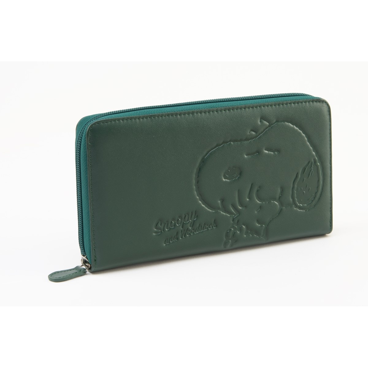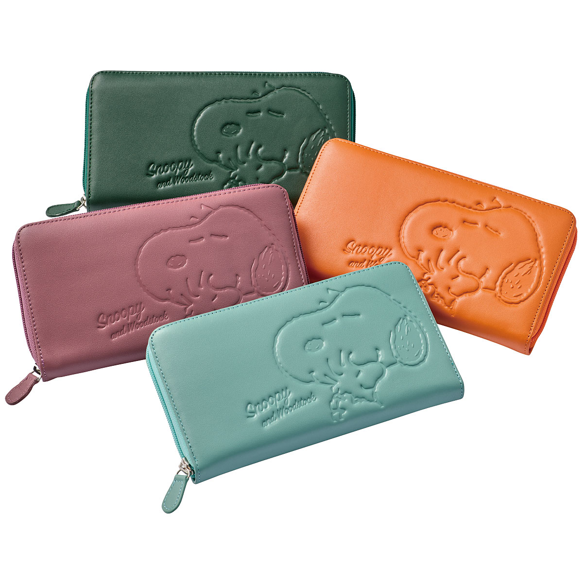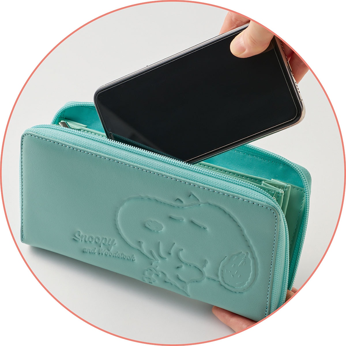 スマホが迷子にならない!ガバッと開く大容量長財布。高級感のある牛革に、スヌーピーを型押し。スマホも入るから、これ1つでお出かけOK!ーデザインー人気のハグ柄。裏面にもスヌーピーとウッドストックの型押しが。ー素材特性ー上質感のある牛革を使用。