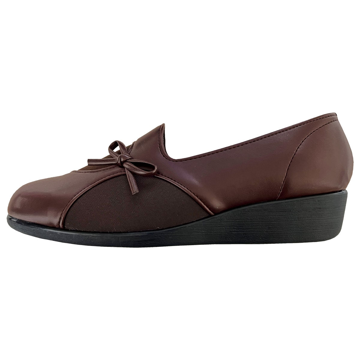大人かわいいサイドリボンののびのびタウンシューズ。カジュアルにもエレガントにも使い勝手のよい一足!ーデザインー丸みのあるフォルムが大人かわいい足元を演出。足指部分には伸びる素材を使用しているため、外反母趾の方にもおすすめです。【ゆったり幅広】【軽量約150g(23cm片足)】