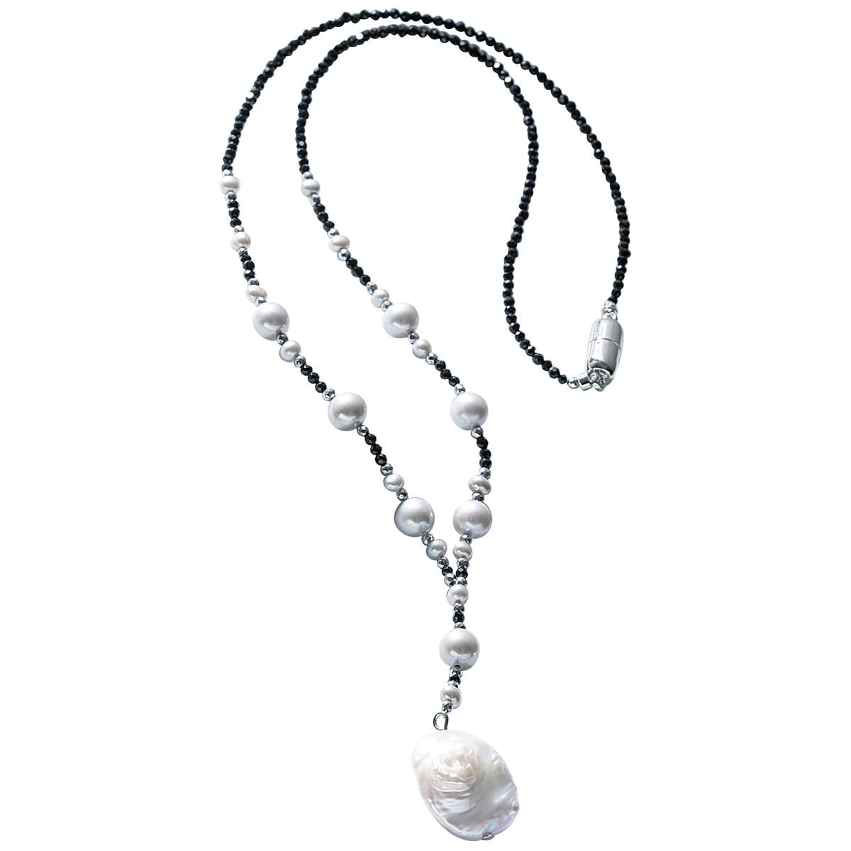 ■材質/淡水パール、スピネル、ヘマタイト(再結晶石)[留め具]真ちゅう(ロジウムメッキ)■マグネット式■サイズ(約cm)/[全長]50[下がり部分]5.5■重量(約g)/13●日本製※自然素材を使用している為、1点ごとの色合いや形状、模様等が異なる場合がございます。※磁石を使用している為、ペースメーカー等の医療電子機器を装着されている方は、ご使用になれません。