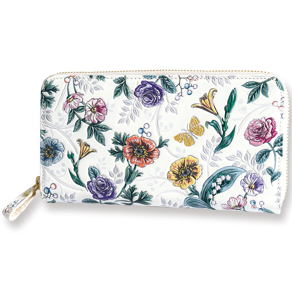 丁寧な手仕事の技法が光るラウンドファスナー長財布。大きく開き、中身が見やすく出し入れ簡単で、収納力もたっぷり!-デザイン-ナチュラルガーデンマルチカラーの6種類の花々(バラ、すずらん、コスモス、ムラサキシキブ、アネモネ、ユリ)が咲き誇り、その中にはゴールドカラーが目を惹く蝶がひらりと舞っています。エレガントで繊細な美しさが魅力のデザインです。-こだわりPOINT-蝶の部分は、職人が一つ一つ本金箔を手作業で貼り付けています。
