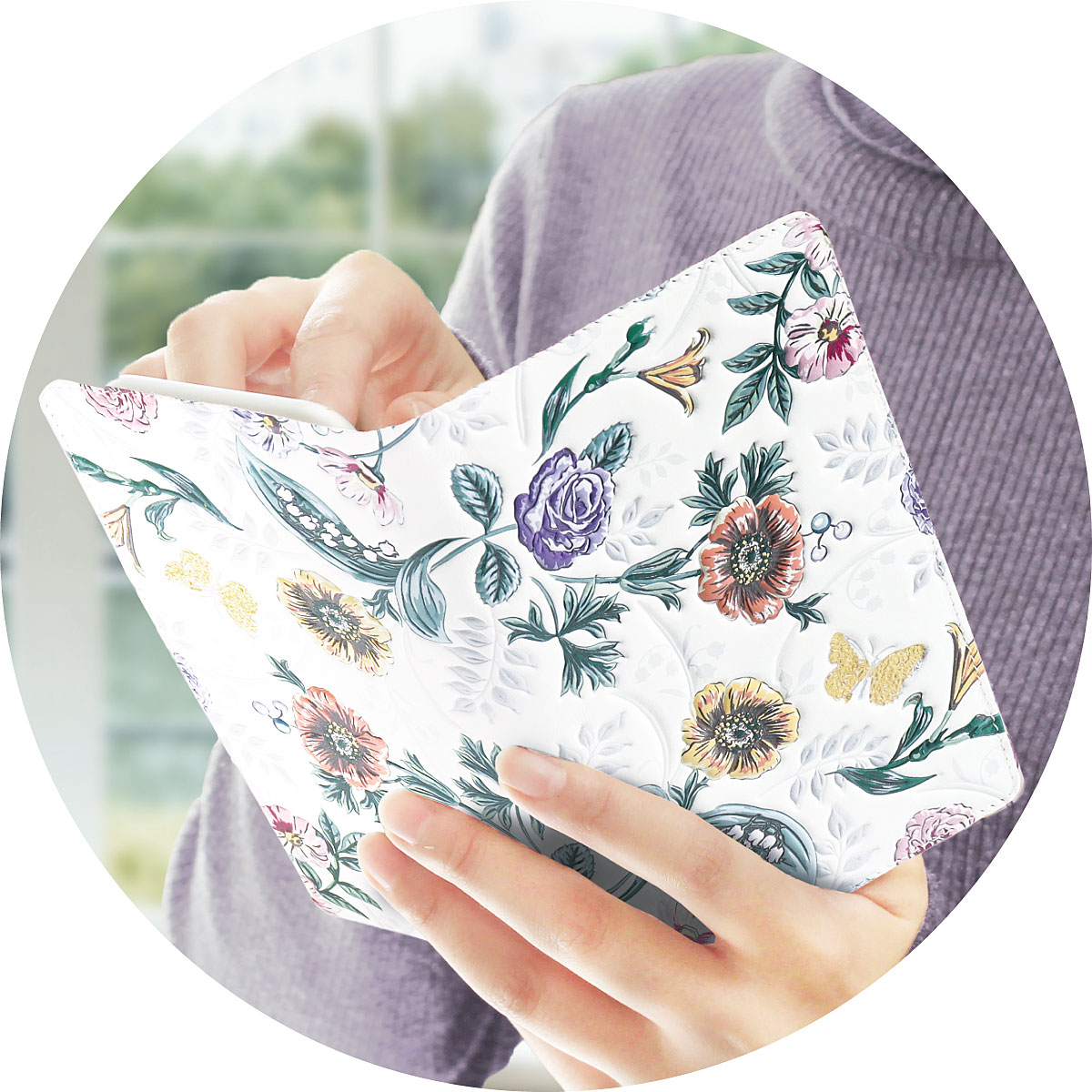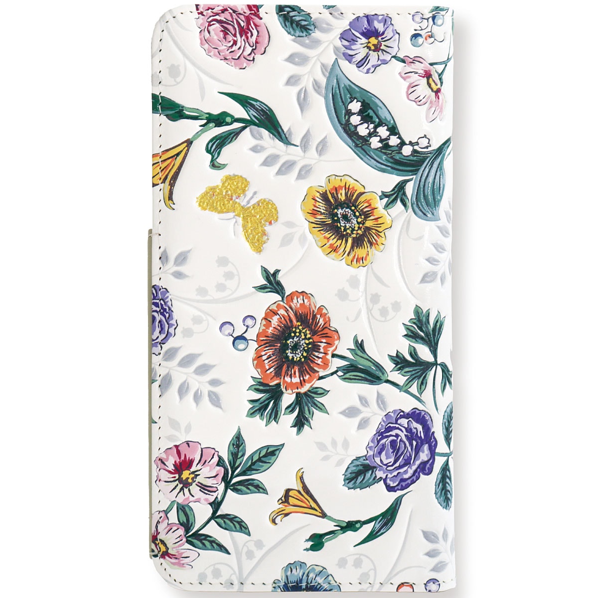 粘着パッドでスマホを固定する手帳型スマホケース。スマホ本体を外側に出せば、ケースを付けたまま撮影が可能!カードやレシートも入るポケット付き。-デザイン-ナチュラルガーデンマルチカラーの6種類の花々(バラ、すずらん、コスモス、ムラサキシキブ、アネモネ、ユリ)が咲き誇り、その中にはゴールドカラーが目を惹く蝶がひらりと舞っています。エレガントで繊細な美しさが魅力のデザインです。-こだわりPOINT-蝶の部分は、職人が一つ一つ本金箔を手作業で貼り付けています。