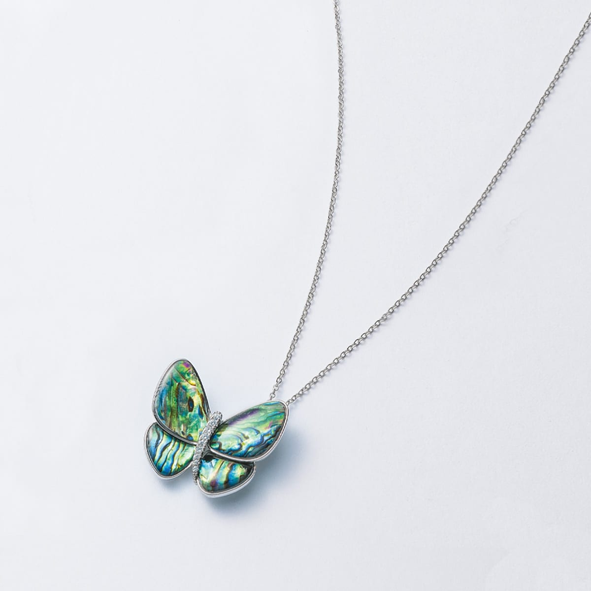 虹色に輝くアバロンシェルを羽の部分にあしらった蝶々モチーフのペンダント。