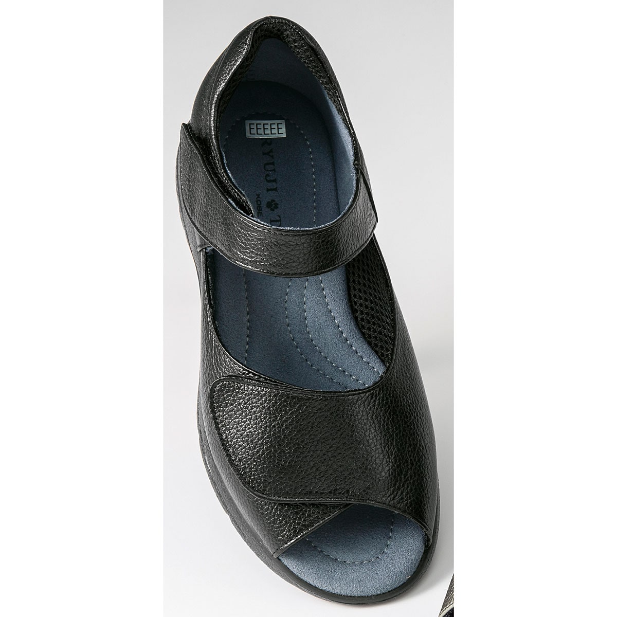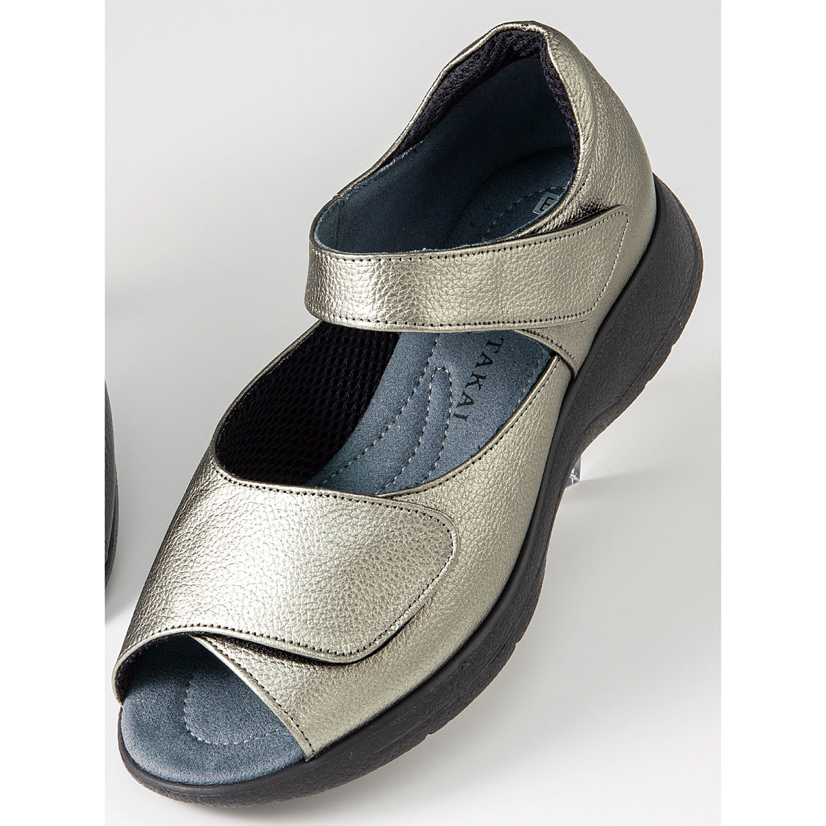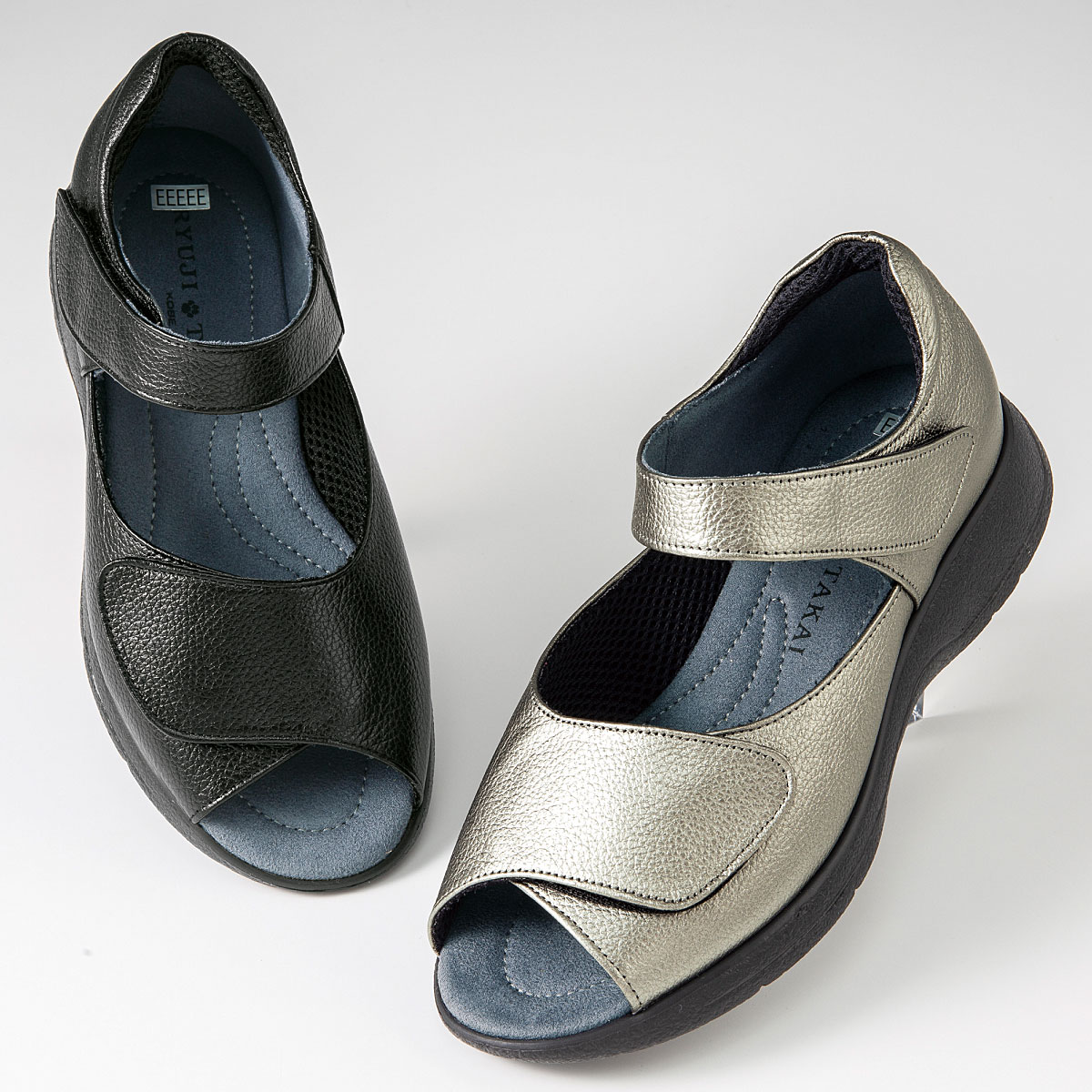ひとりひとりの足にフィットするWベルトサンダル。ーこだわりPOINTー・2箇所の面ファスナー仕様のベルトで脱ぎはきラクラク&甲部分と足首部分もジャストフィット。・「外反母趾の方でもラクにおしゃれにはける靴」をコンセプトに開発。・5Eながらスッキリ見えるデザインで足運びも軽快に。