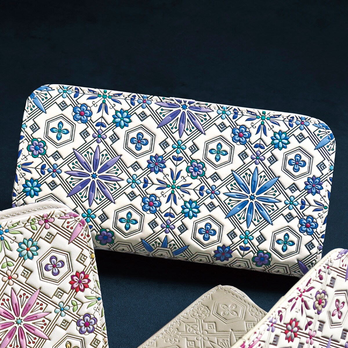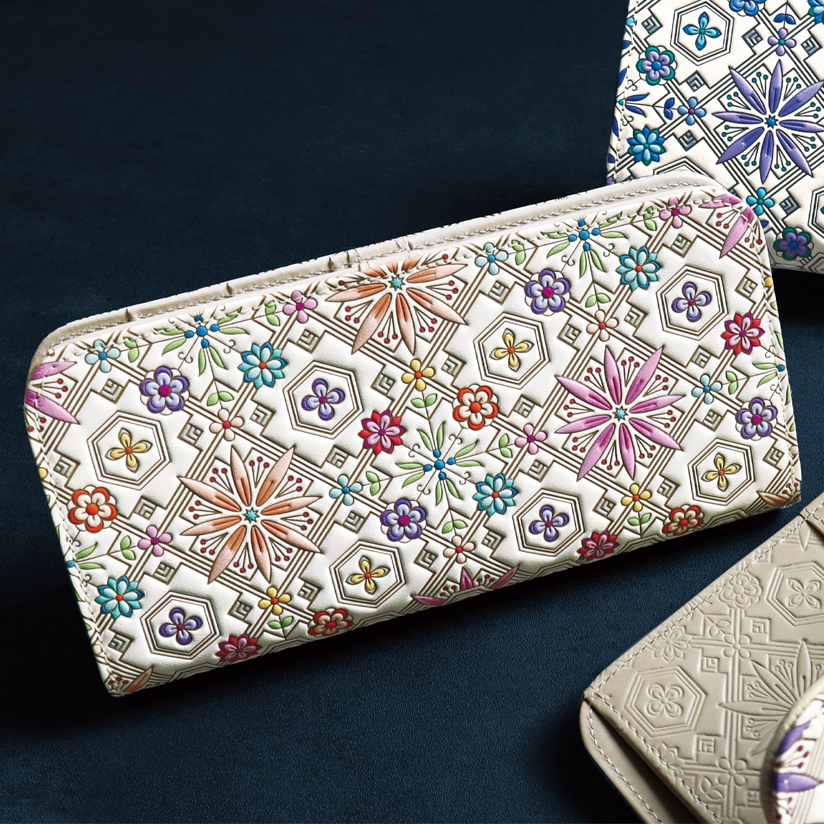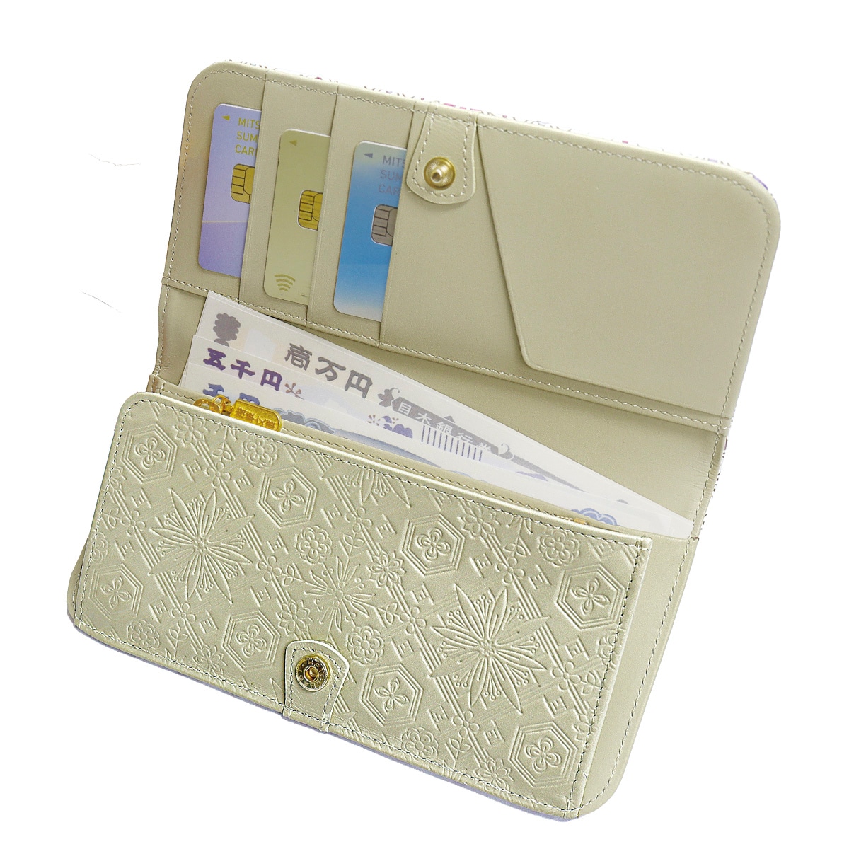 美しい型押しを内側にも施し、華やかさをプラス。コンパクトながらお札を折らずに収納できます。