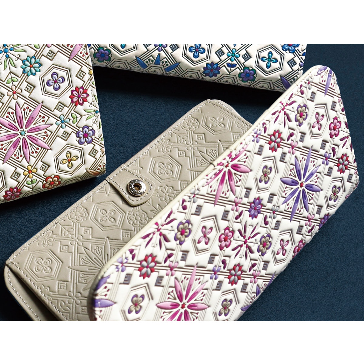 ~浅草文庫®~白くなめされた革に、色鮮やかな絵柄を描いた浅草文庫。友禅の枝を駆使し、職人が丹念に作り上げます。白革に寸分のズレがないよう色を重ね、立体感を出すために型押しをすると、生き生きとした表情を与えていきます。汚れにくい加工も施されており、使いやすさや機能も十分。永く愛用いただける革小物です。■材質/[表]牛革 [内側]牛革、レーヨン ■サイズ(約cm)/9×17.7×3 ■重量/約115g ■仕様/[開閉]ホック式 [内側]札入れ×1、ファスナー式小銭入れ×1、オープンポケット×2、カード入れ×3 ●化粧箱入り※裏面は同柄です。※天然革の特性上、商品によって多少色が異なります。※商品によって柄の出方が多少異なります。※職人が一点一点丁寧に製作しているため、多少趣が異なる場合がございます。 ●日本製
